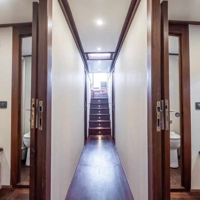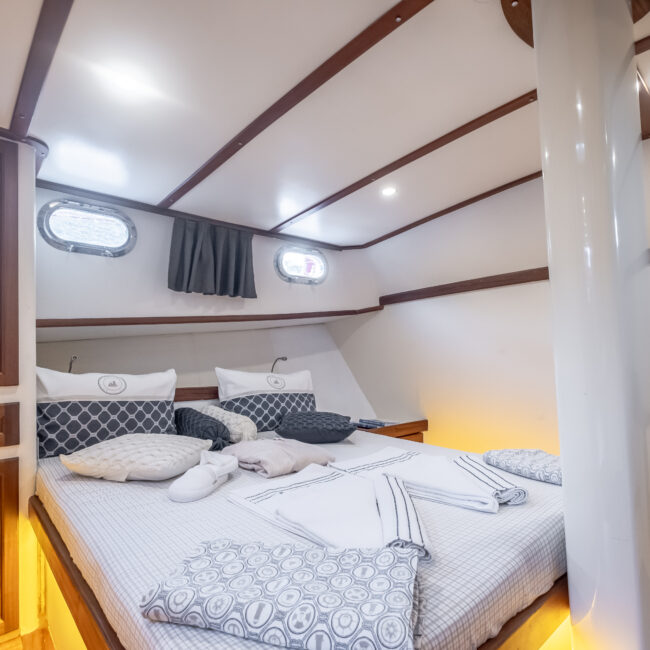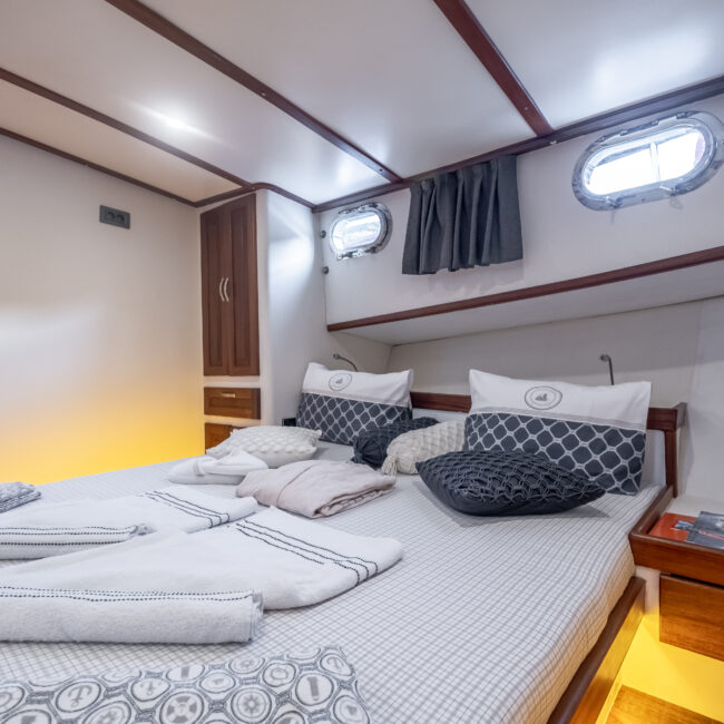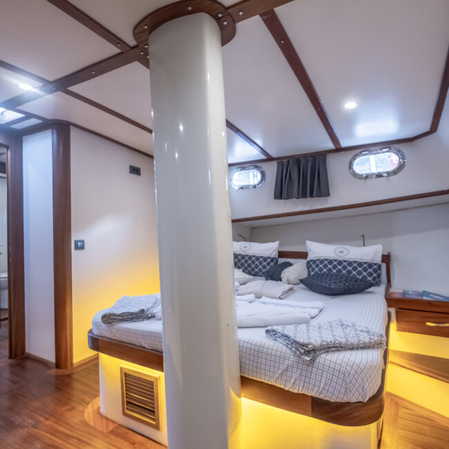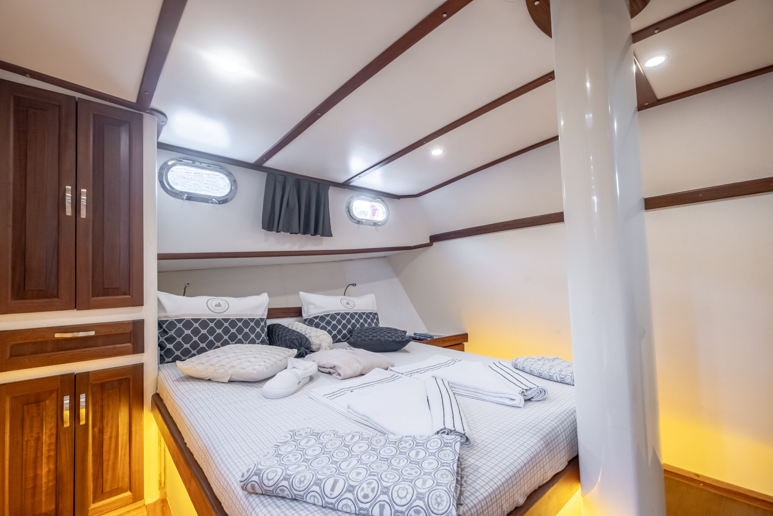 Gulet Leylali ; 23 metre uzunluğunda,1 Master + 4 double olmak üzere toplam 5 kabiniyle 10 kişi konaklama kapasitesine sahiptir.