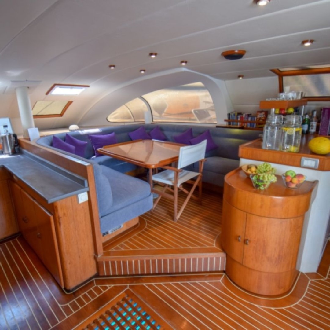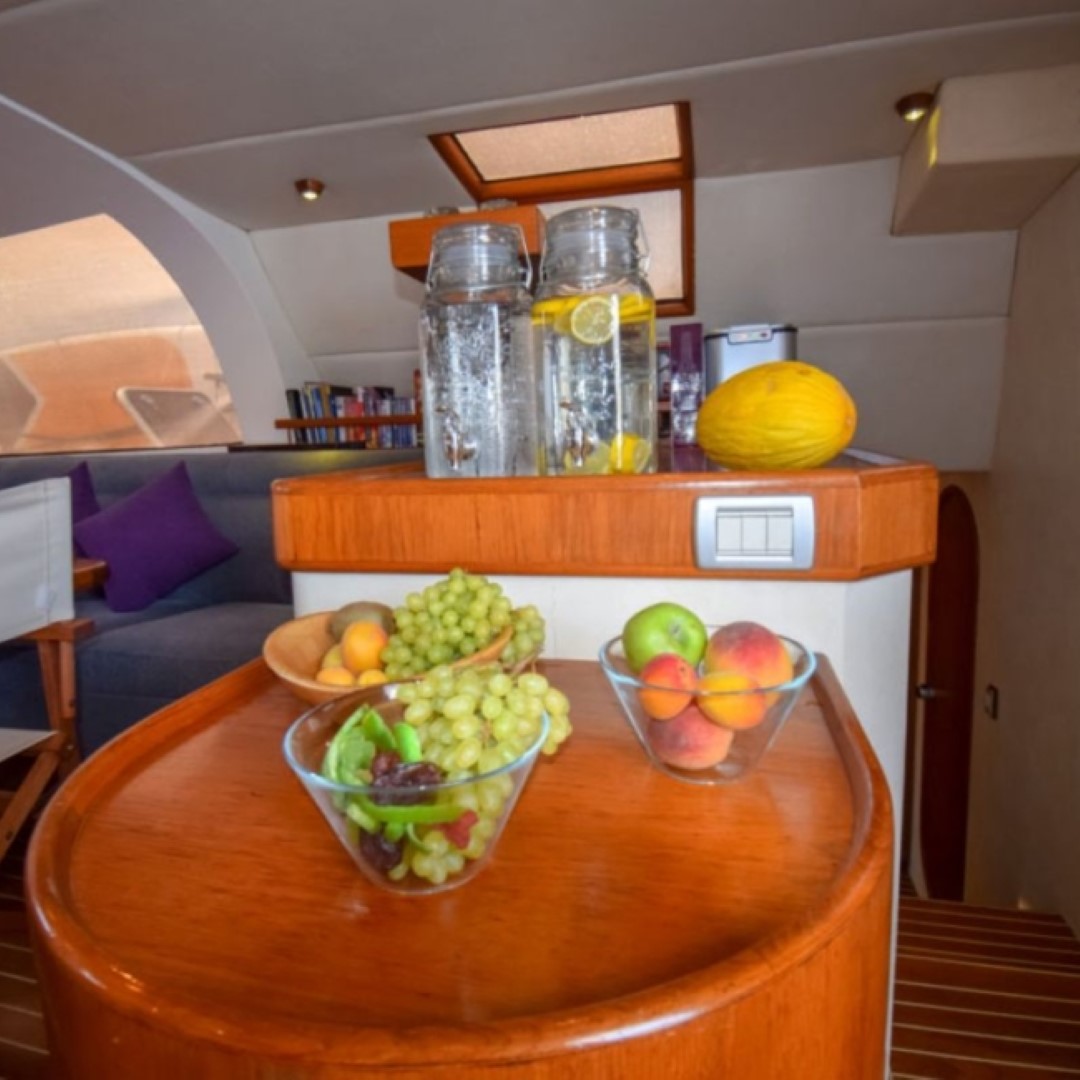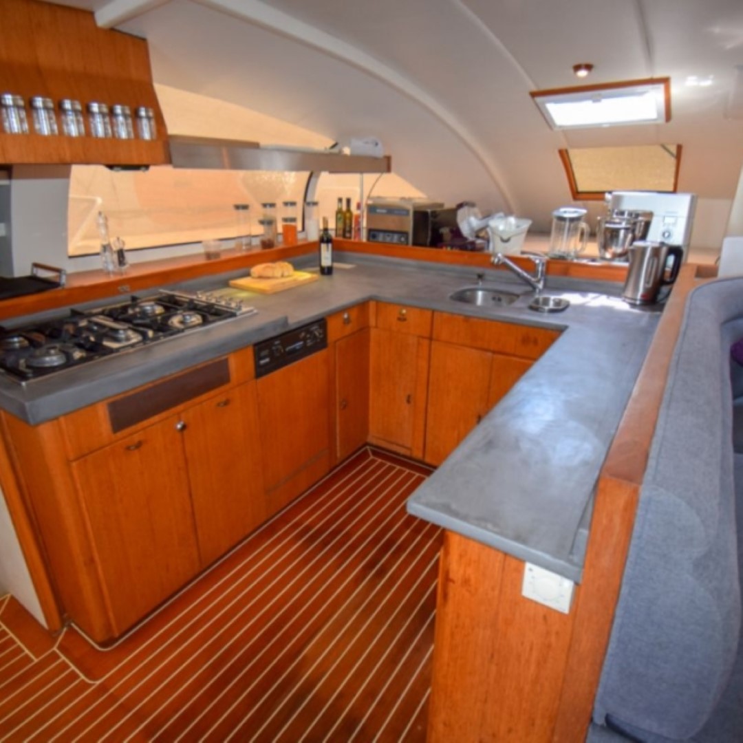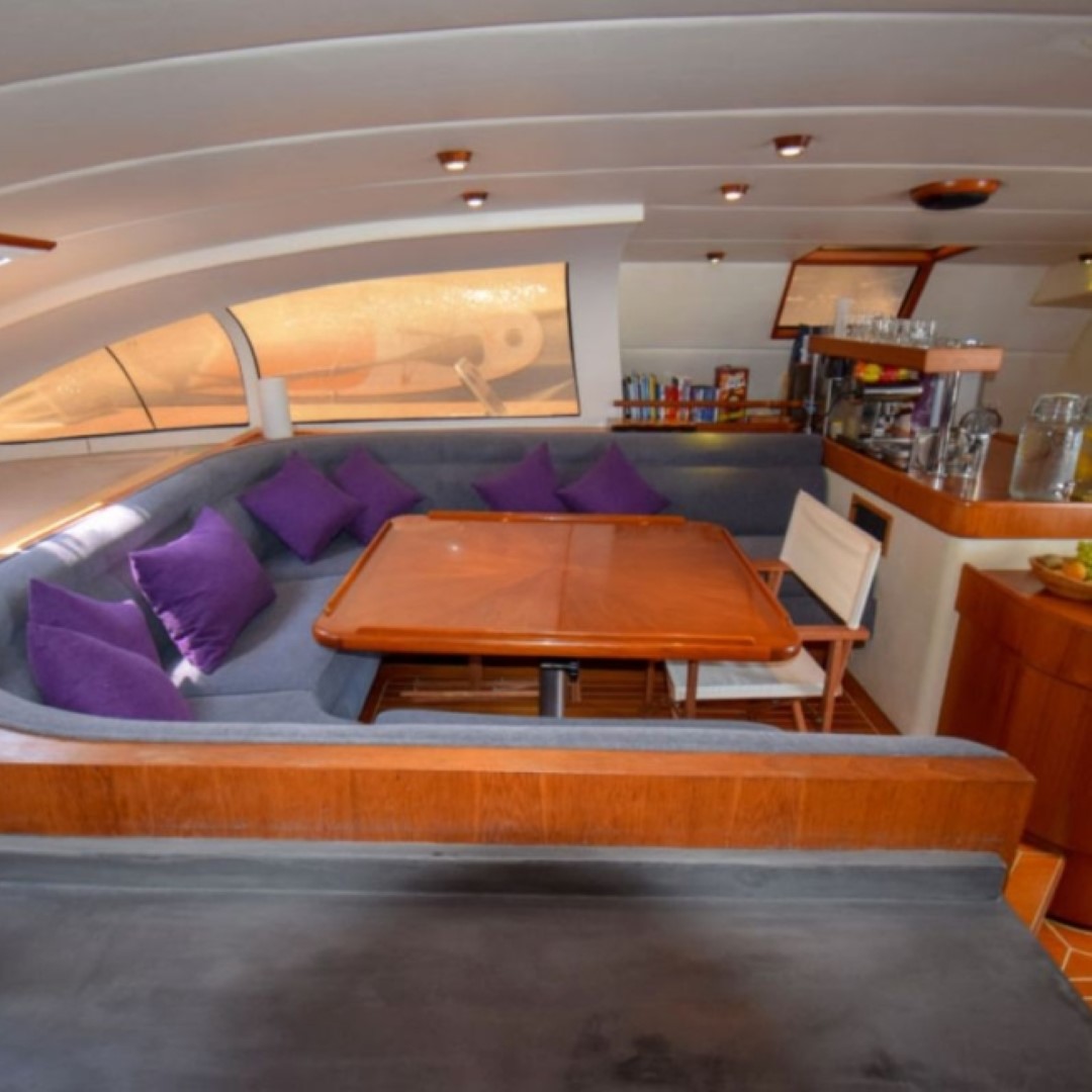 Katamaran Luna, 1994 yılında fiberglas gövdeden 17.5 metre uzunlukta, 8.60 metre genişlikte ve 1.60 metre derinlikte inşa edilmiştir. Her yıl bakımları yapılan teknemiz 2018 yılında modern şekilde renovasyona uğrayıp son halini almıştır. Lüks katamaranımız 3 Double Kabinde 6 misafir ağırlayabilmektedir. Kabinler geniş ve ferah olup Televizyon, Müzik Sistemi, Klima, Duş ve Wc mevcuttur. Geniş bir yelken ağına sahip olup kolay sürüş imkanı mevcut olan bir katamarandır. Mutfak ve Yemek Masası ’’U Tipi’’ yapıda olup geniş bir saklama alanı mevcut ayrıca buz yapıcı ve kahve makinesi mutfakta yer almaktadır. Salonda internet, televizyon, müzik sistemi güvertede müzik sistemi geniş güneşlenme alanı ve minderleri mevcuttur.