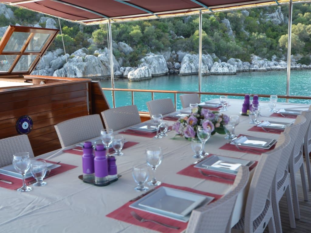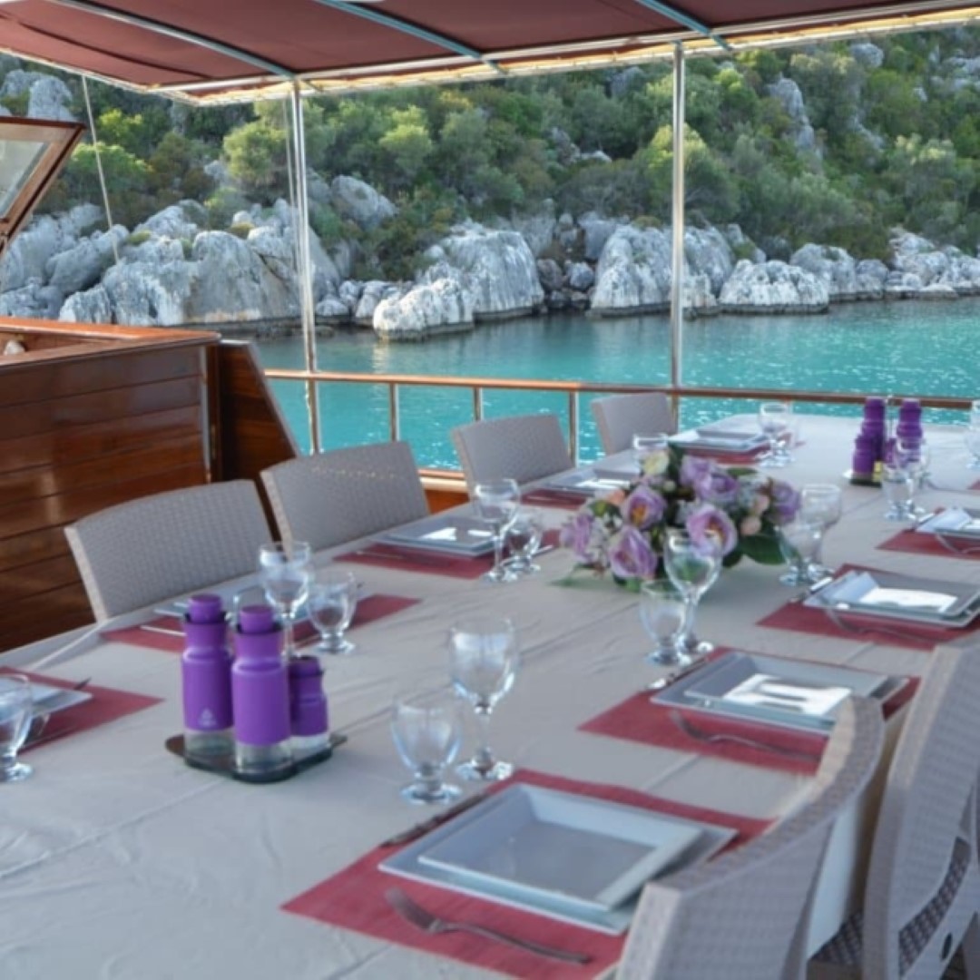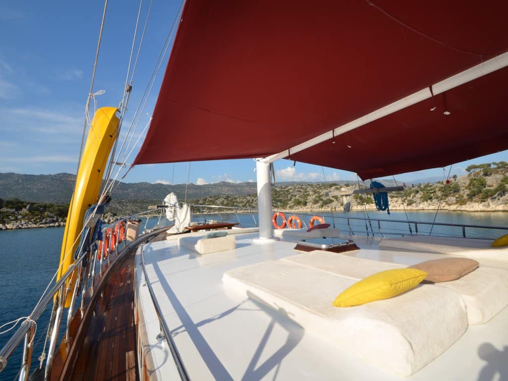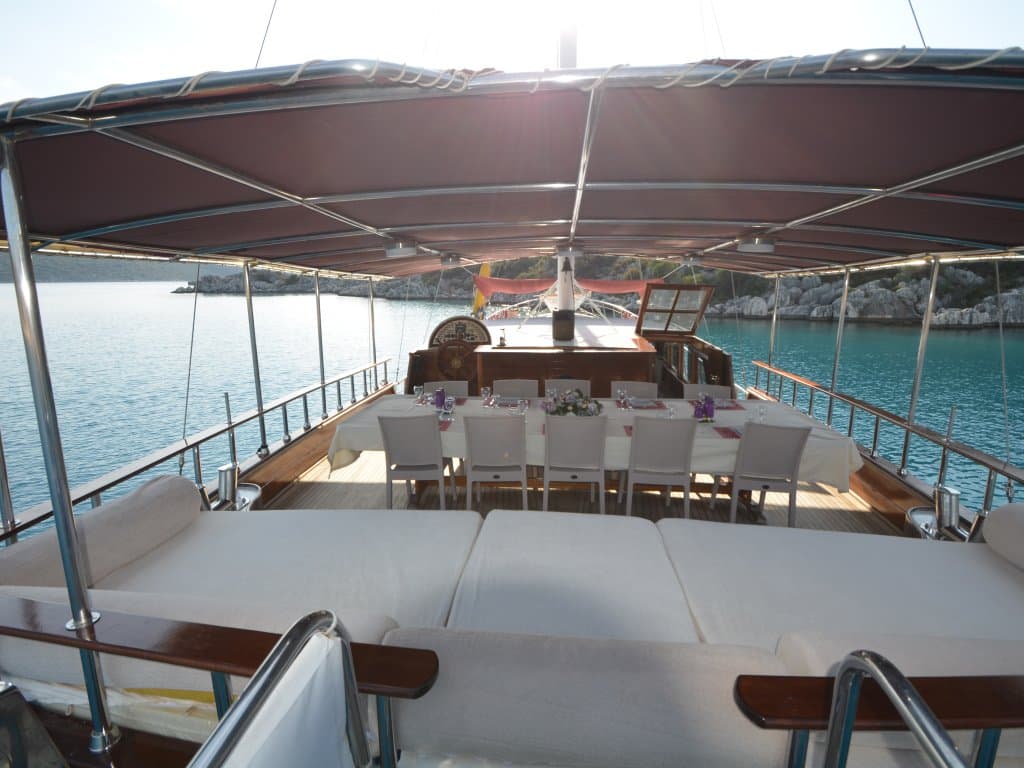 Mozaik gulet yatımızda tüm misafirlerimiz için yeteri kadar güneşlenme minderleri, dinlenme alanları, sandalye, yemek masası bulunmaktadır.