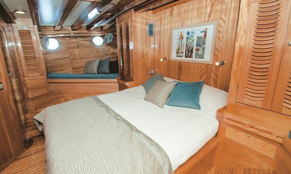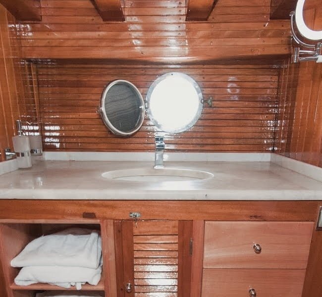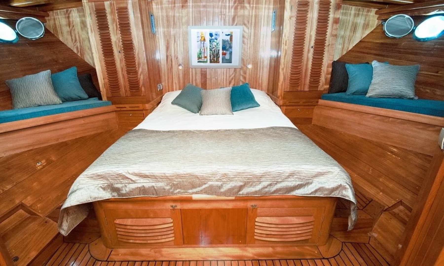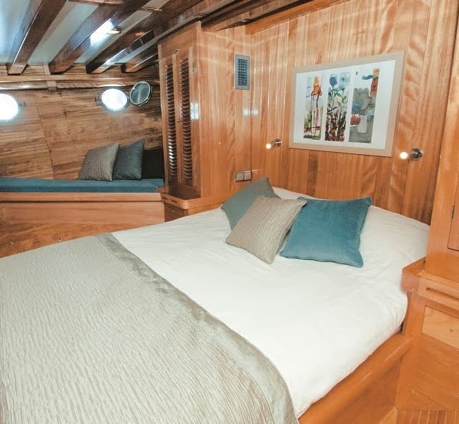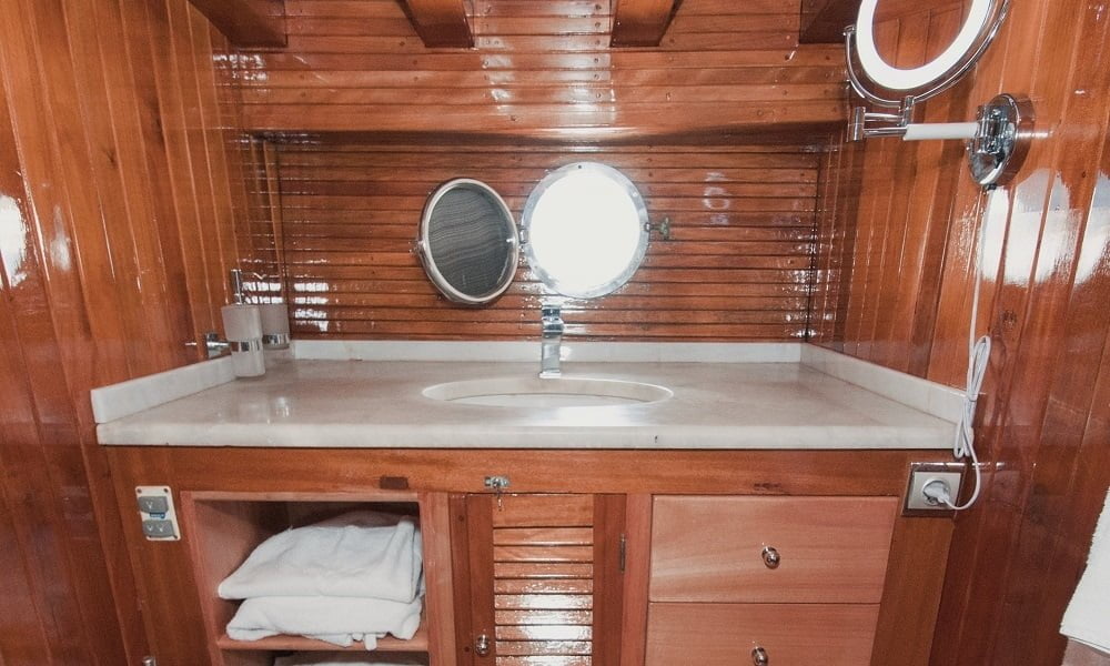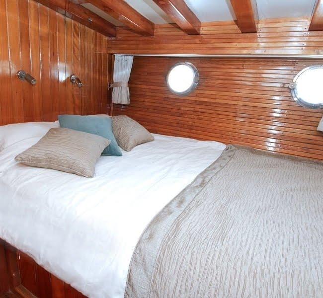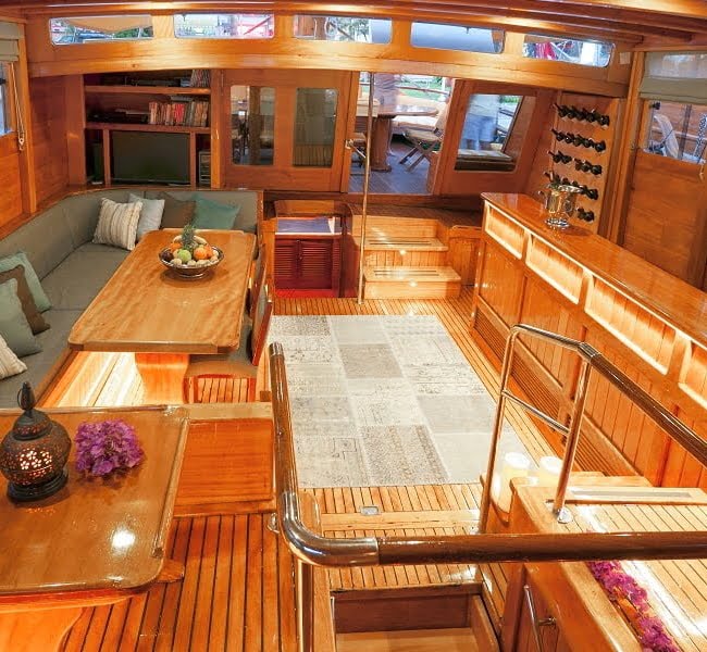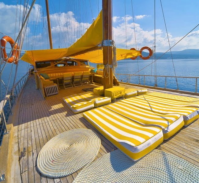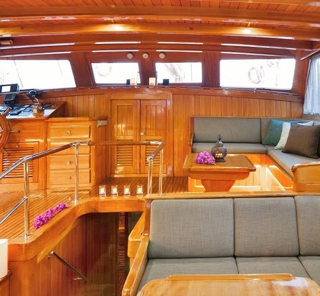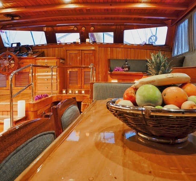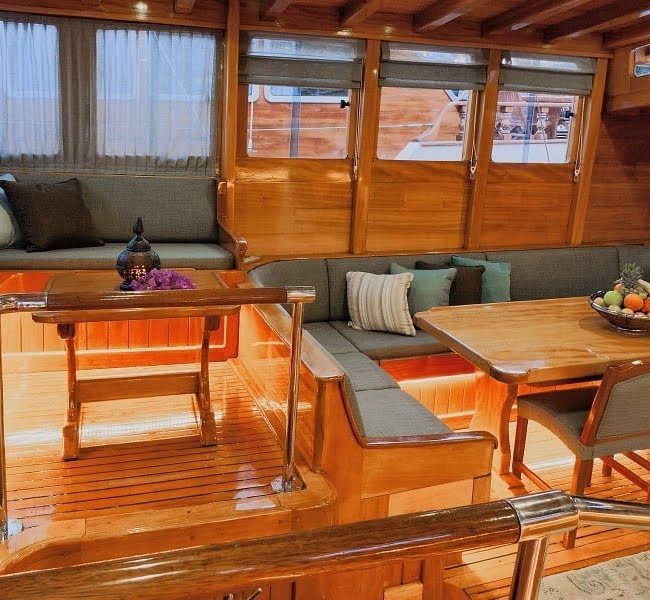 Geniş güvertesi ile kendi sınıfında farkını belli eden teknemiz, yaşam alanlarının konfor ve rahatlığı birlikte sunması sebebi ile sıklıkla tercih edilmektedir. Yemek masaları 3 farklı bölümde bulunmaktadır. Sizlerin rahatlığınız için teknenin arka ve ön kısımlarında yemek yeme imkanı mevcuttur. Ayrıca eğer sıcaktan bunaldıysanız klimalı salonda yemek keyfi yapabilirsiniz. Gulet Myra teknemiz birbirinden değişik ve son moderne uygun dizaynı ile dikkat çekmektedir. Duşta yer alan mozaik döşemeler ise teknemize bambaşka bir hava katmaktadır. Ahşabın mükemmel dizaynının oön planda olduğu bu teknede keyifli tatil yapma imkanına sahipsiniz.