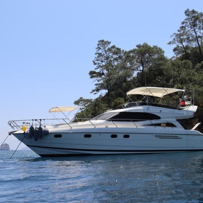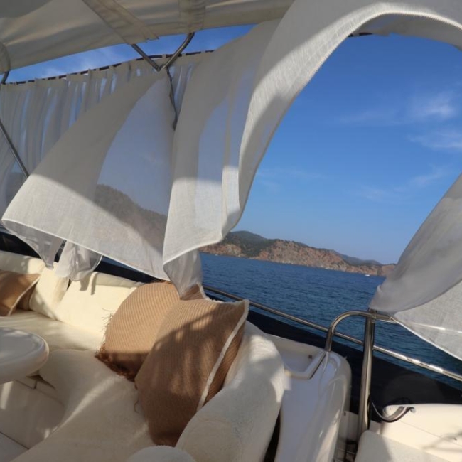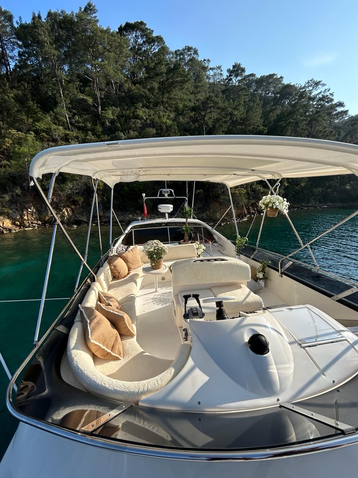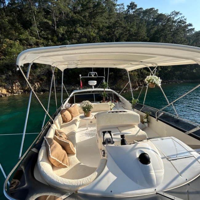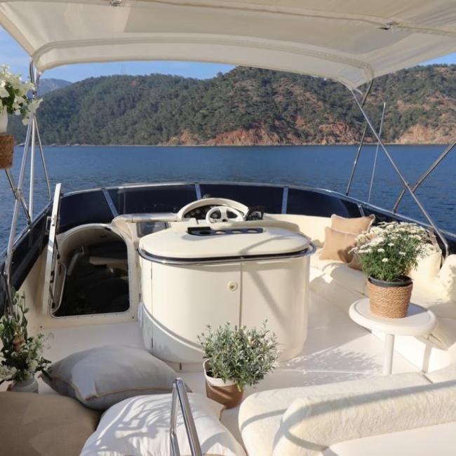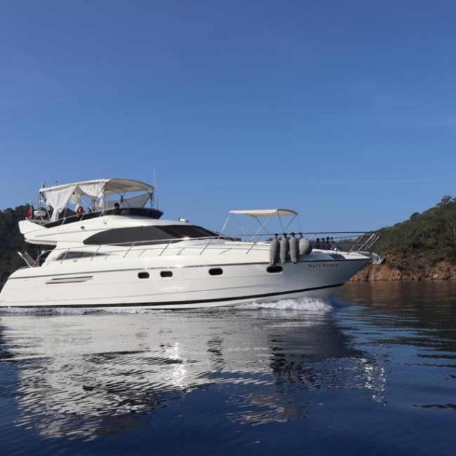 Nate White Motoryacht Offering Luxury and Elegance Together Nate White offers the best service to its guests with both its aesthetic design and functional details. The cabins on the boat are specially designed for your comfort: 1 Master Cabin: It takes blue cruise comfort to the next level with its stylish and spacious design. 1 Double Cabin and 1 Twin Cabin: Offers areas where you can comfortably stay with your guests. While each cabin has air conditioning, the bathrooms attract attention with their modern designs. Large living spaces make the luxury offered by Nate White even more evident.