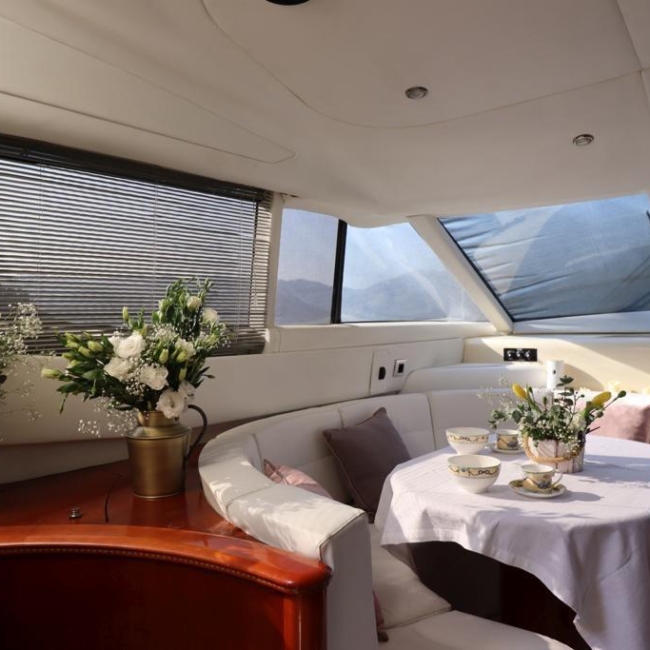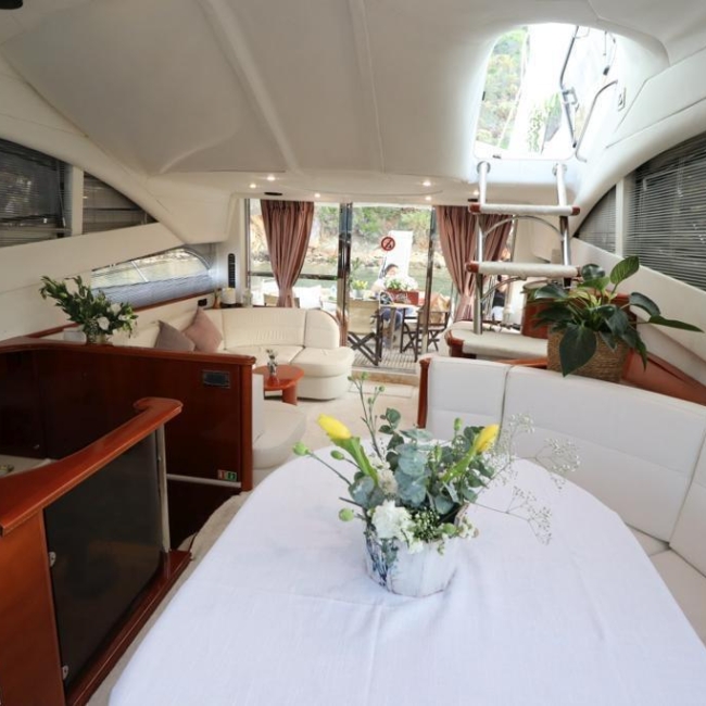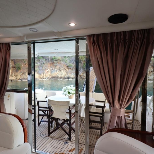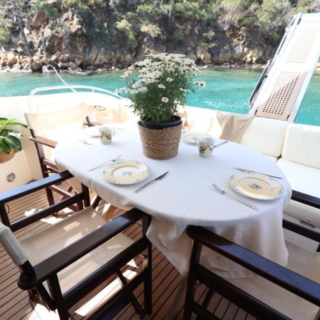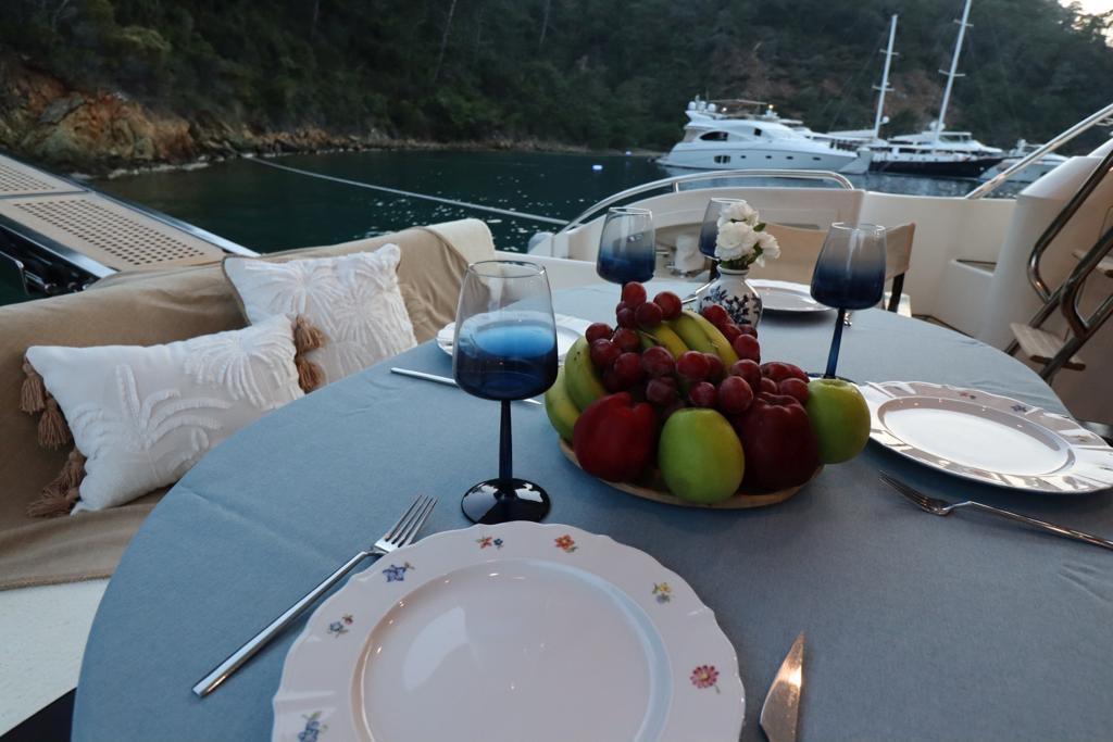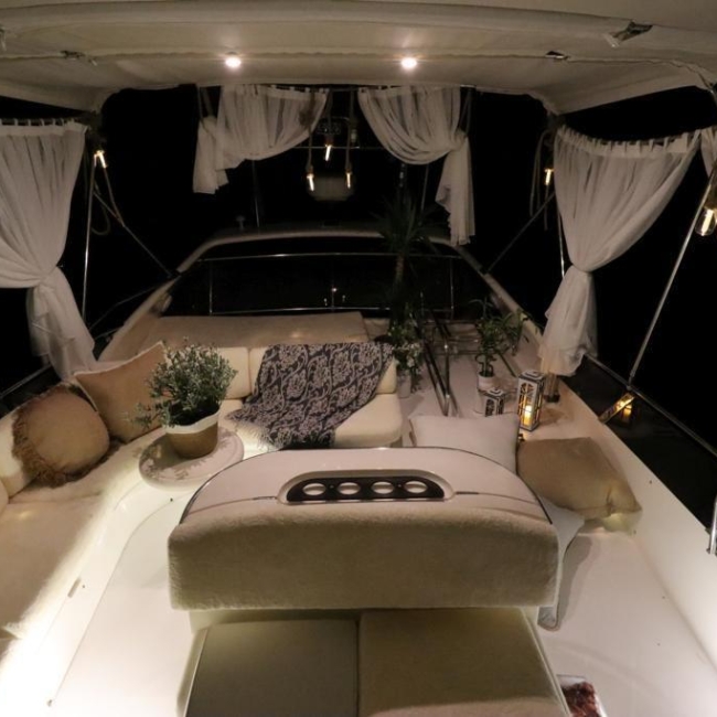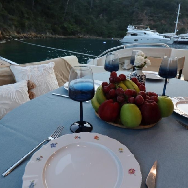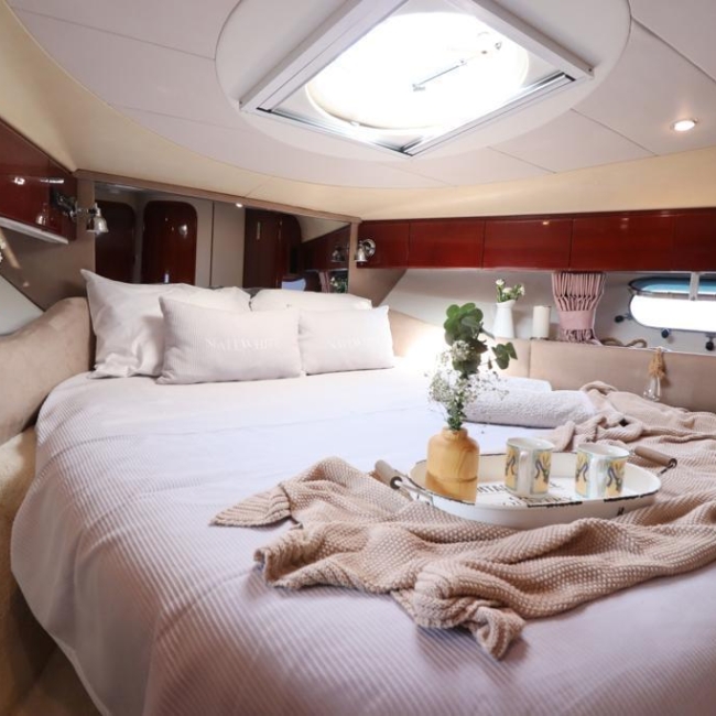 Nate White Motoryacht Offering Luxury and Elegance Together Nate White offers the best service to its guests with both its aesthetic design and functional details. The cabins on the boat are specially designed for your comfort: 1 Master Cabin: It takes blue cruise comfort to the next level with its stylish and spacious design. 1 Double Cabin and 1 Twin Cabin: Offers areas where you can comfortably stay with your guests. While each cabin has air conditioning, the bathrooms attract attention with their modern designs. Large living spaces make the luxury offered by Nate White even more evident.
