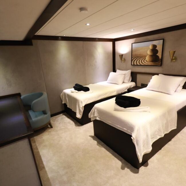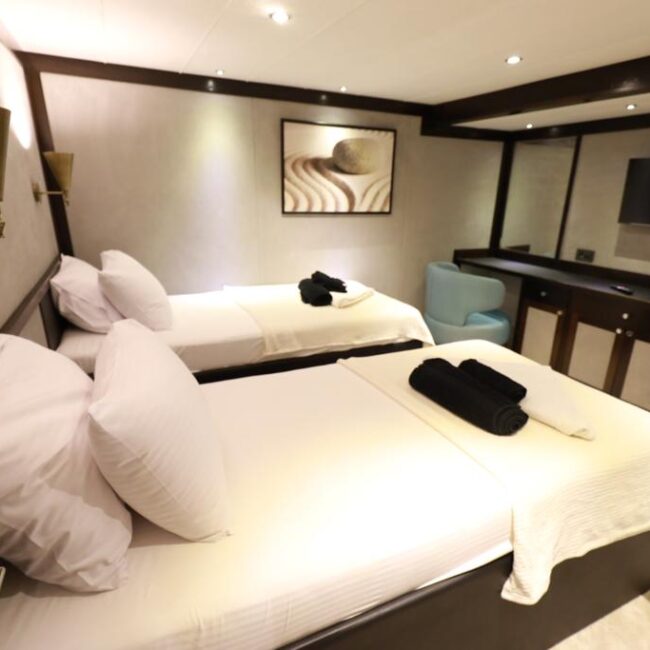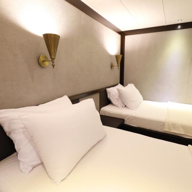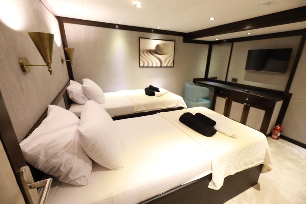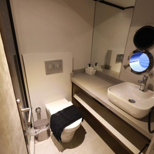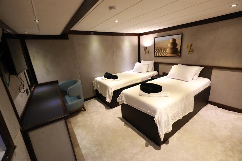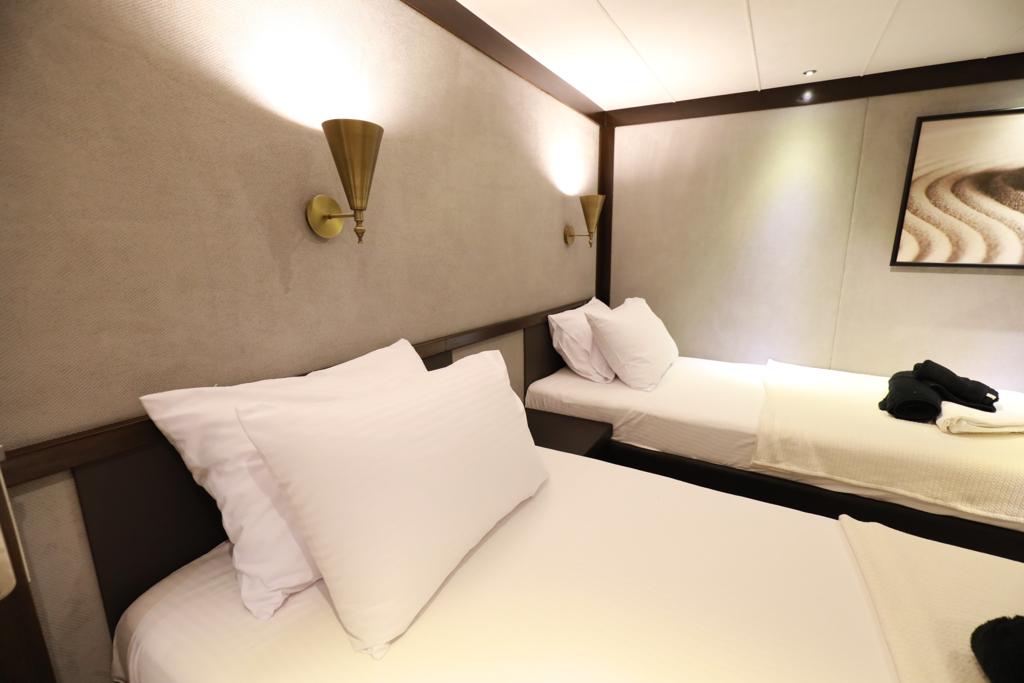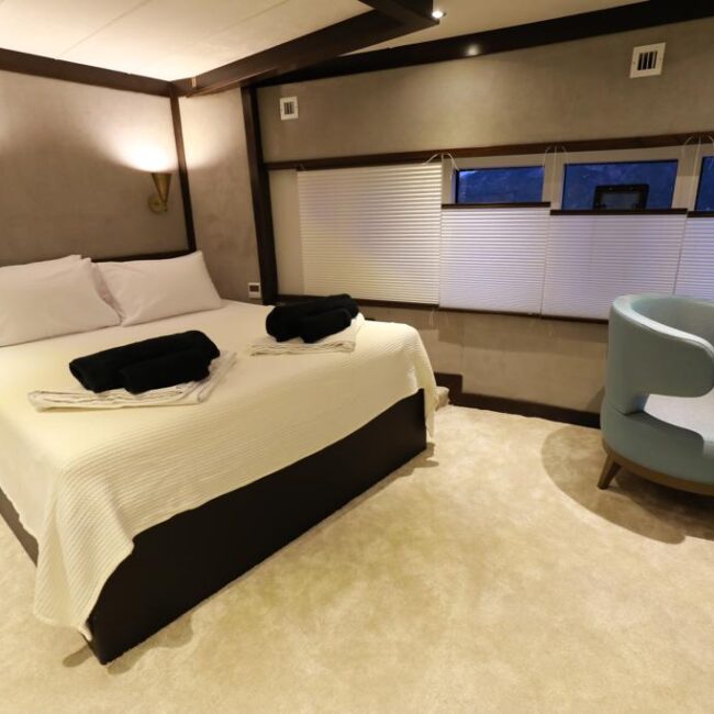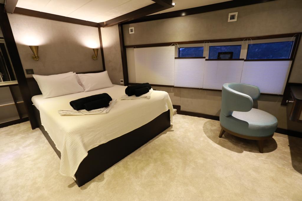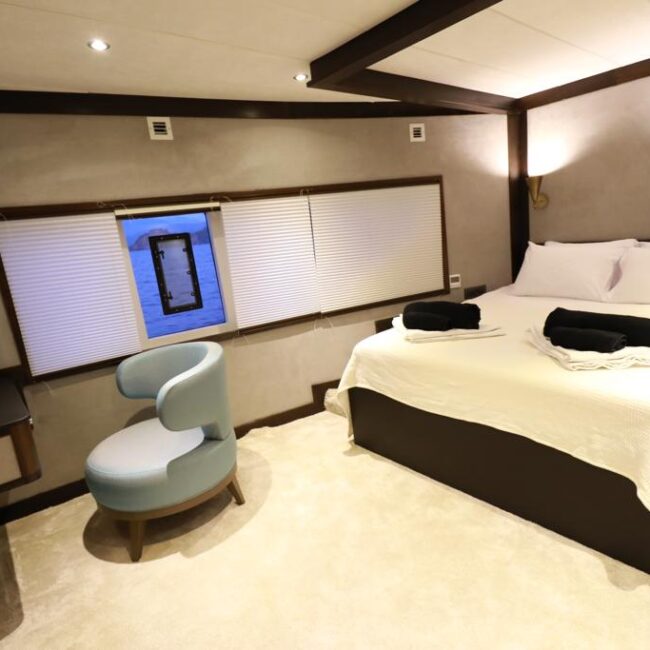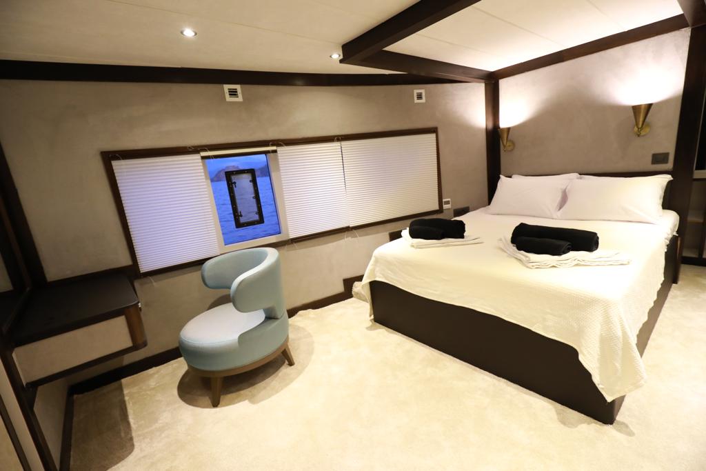 bir iç tasarıma sahiptir. Ana güvertede yer alan geniş ve ferah master kabin, ayrıcalıklı bir konaklama deneyimi sunuyor.3 adet double kabin ve 2 adet twin kabin de