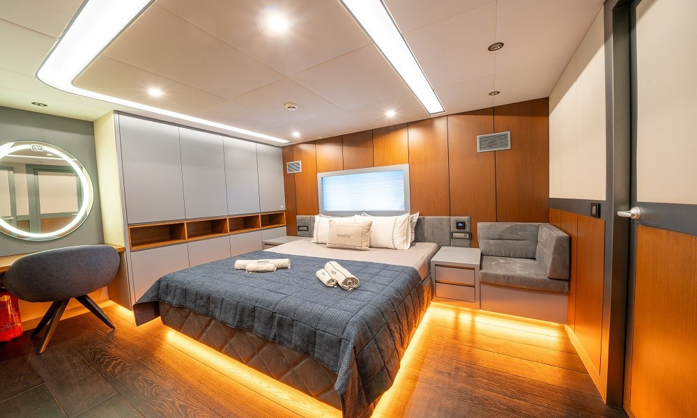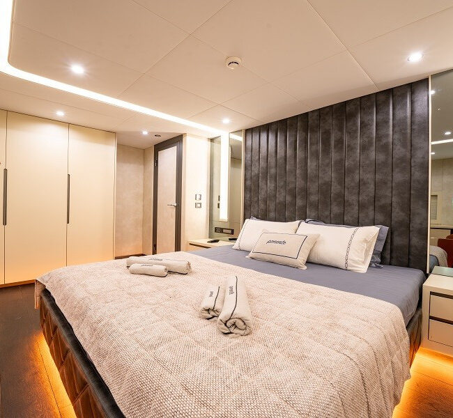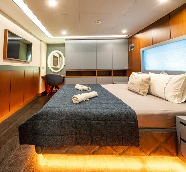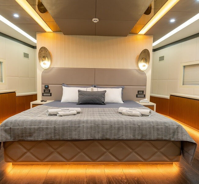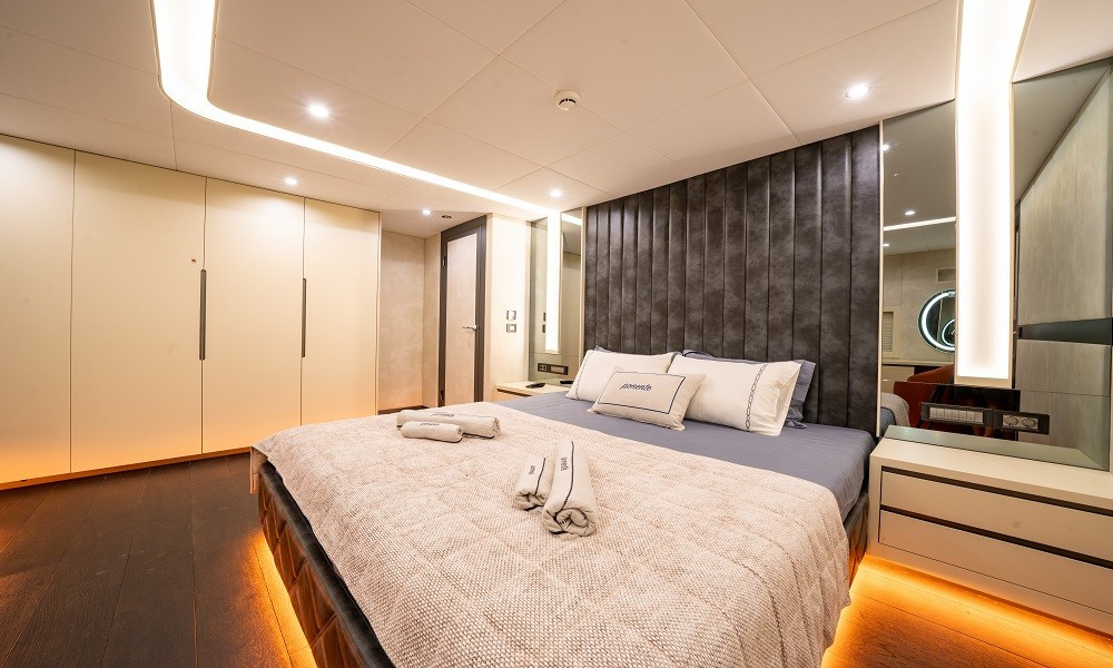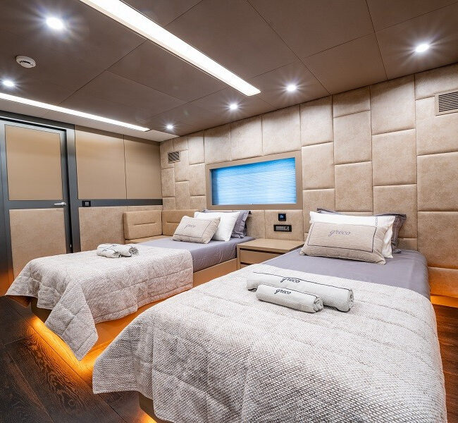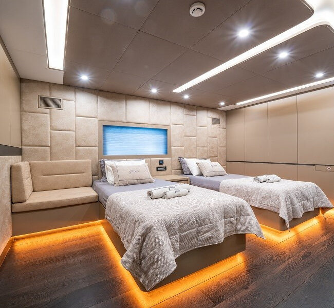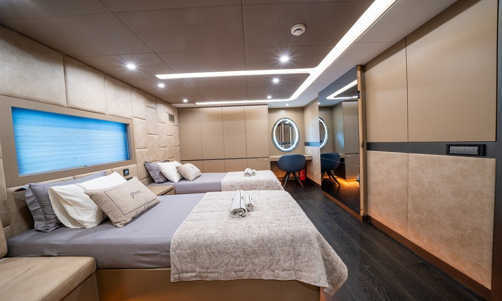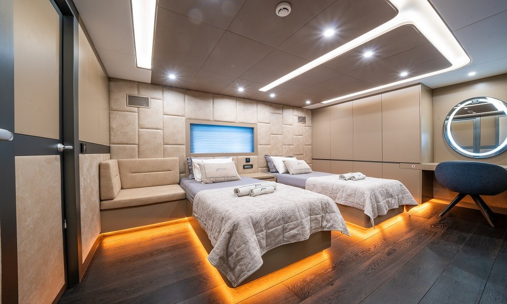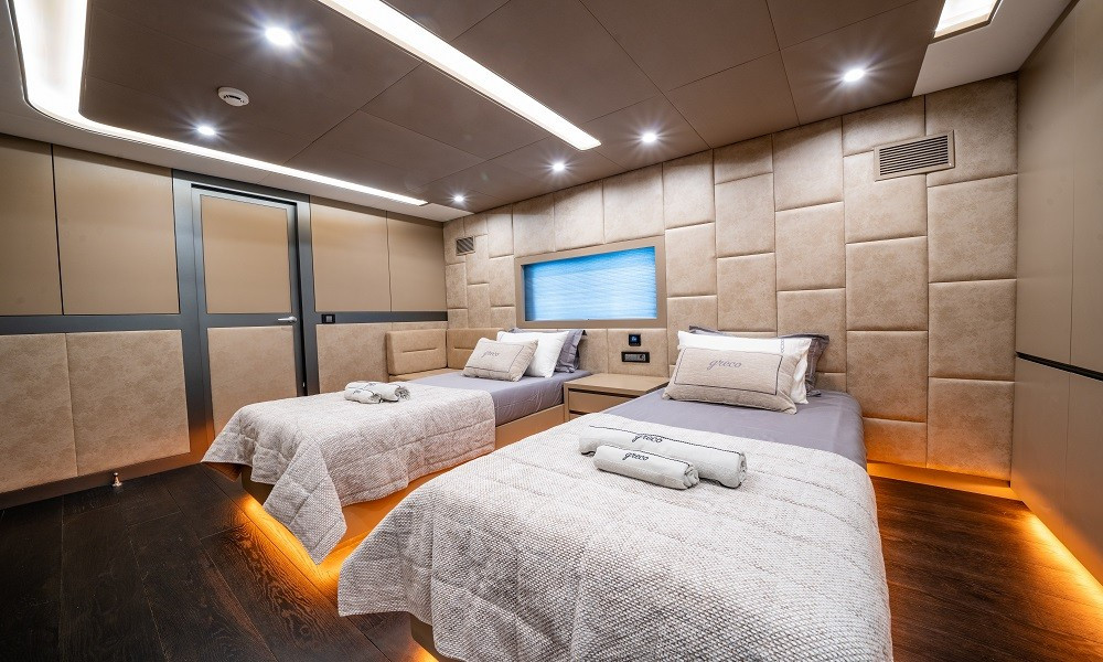 Toplamda 5 kabin: 1 master, 3 double ve 1 twin kabini mevcuttur. Maksimum konaklama kapasitesi 10 kişidir.