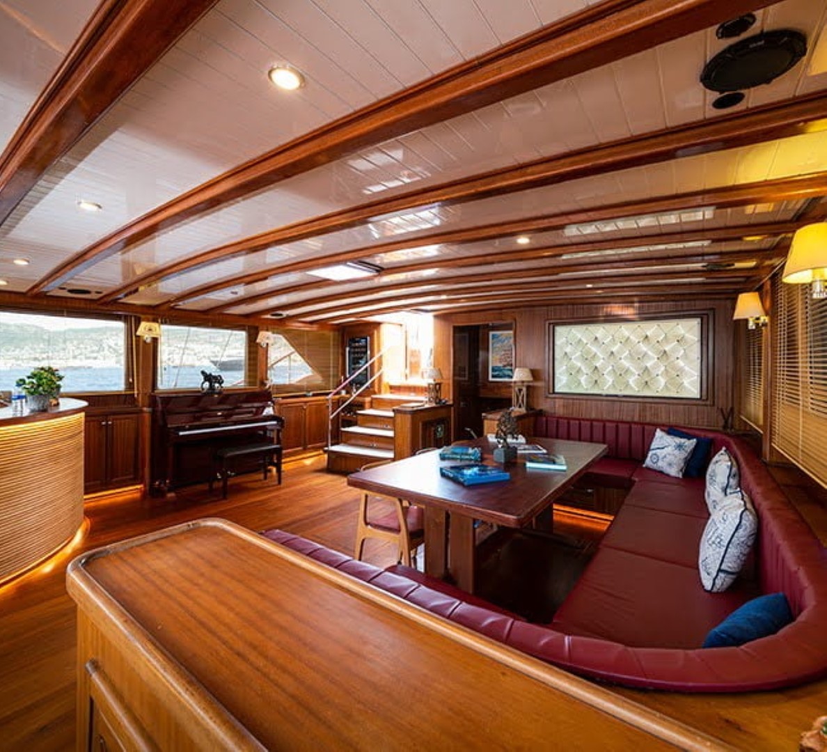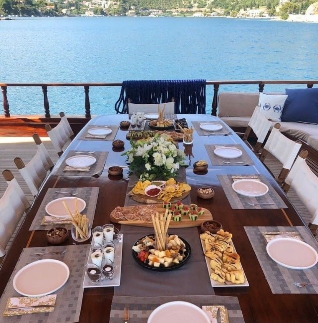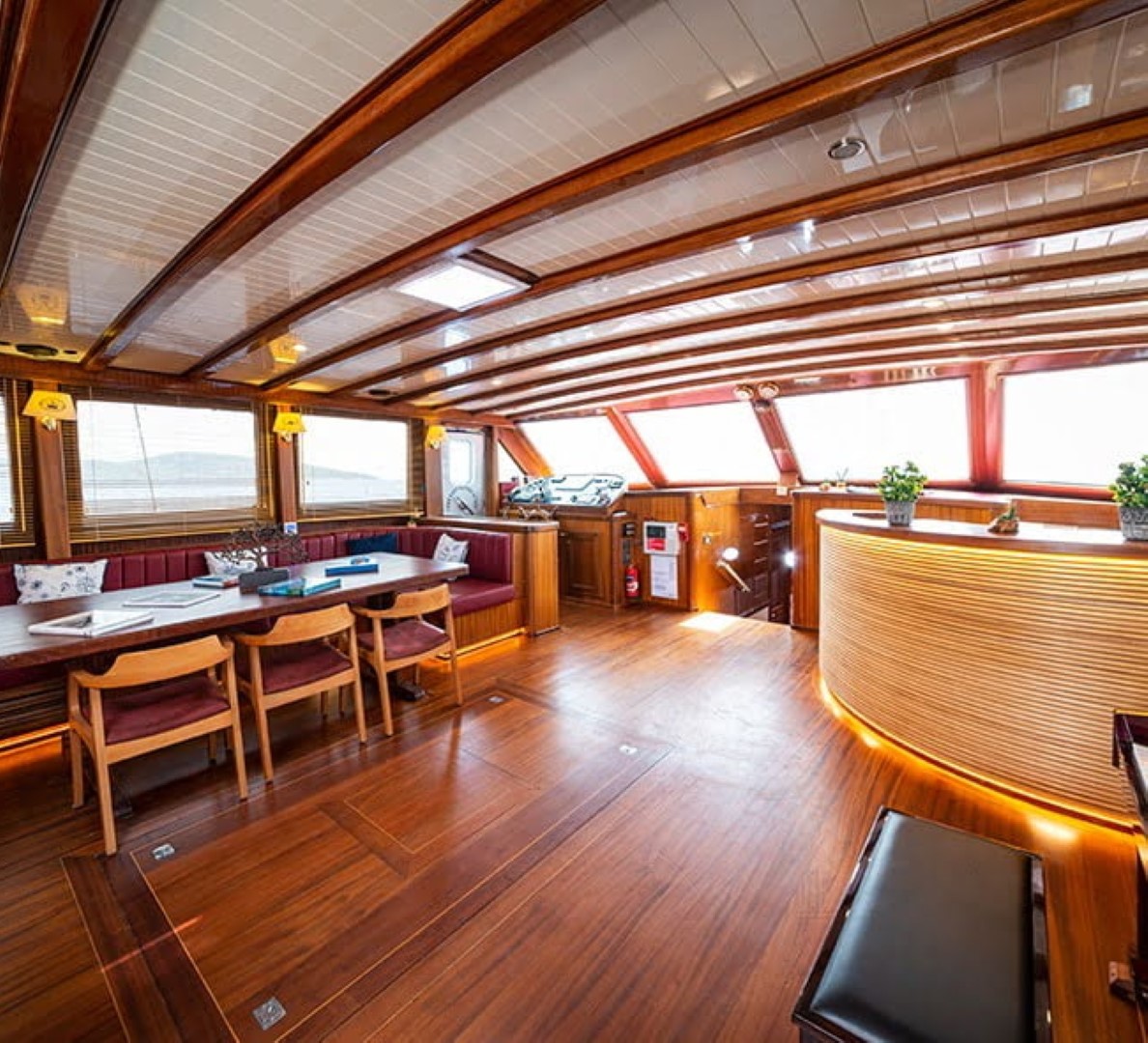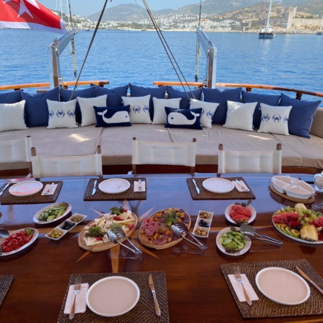 Kıç güvertede geniş minderli bir oturma alanı, yemek masası ve yemek alanı bulunmaktadır. Salonda ise ayrı bir yemek masası olup yemekleriniz tam donanımlı ayrı bir mutfakta hazırlanmaktadır. Queen Of Datca Gulet tüm misafirleri için yeterli güneşlenme minderlerine sahip olarak düzenlenmiştir. Farklı rotalar keşfetmek, konforlu bir tekne kiralamak ve Avrupa’da keyifli bir mavi tur tatili yapmak istiyorsanız Gulet Queen Of Datca sizin için en doğru seçimlerden biri olacaktır