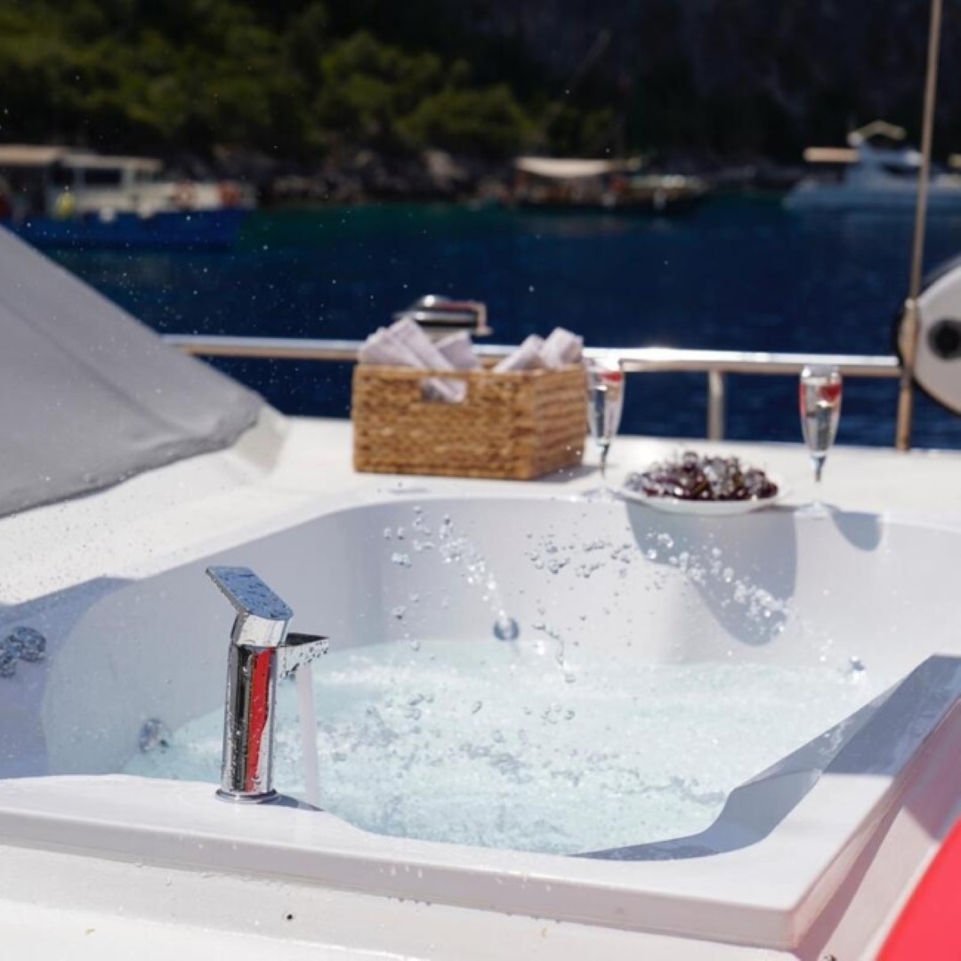 Ayrıca güvertede bulunan jakuzi ile kendinizi beş yıldızlı otelde hissedip tatilinize renk katabilirsiniz.