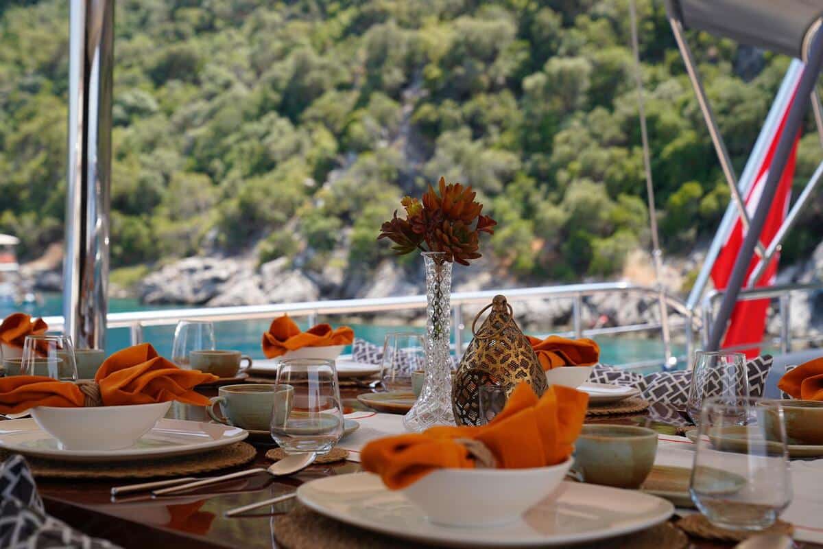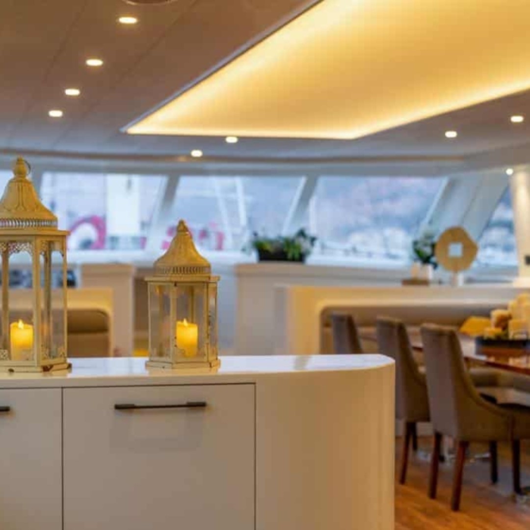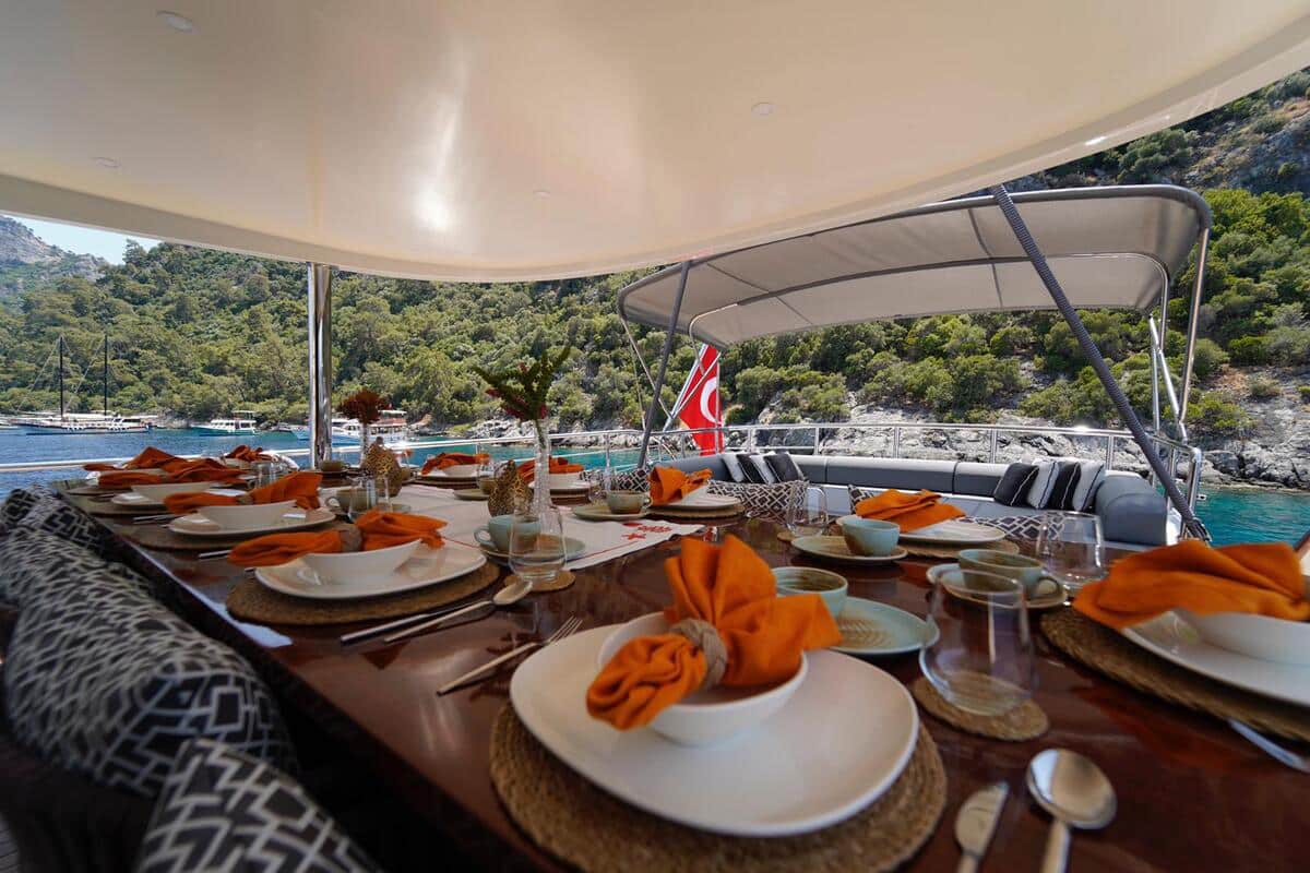 Salonda ve güvertede bulunan yemek masalarına farklı lezzetlerin tadını çıkarabilirsiniz.
