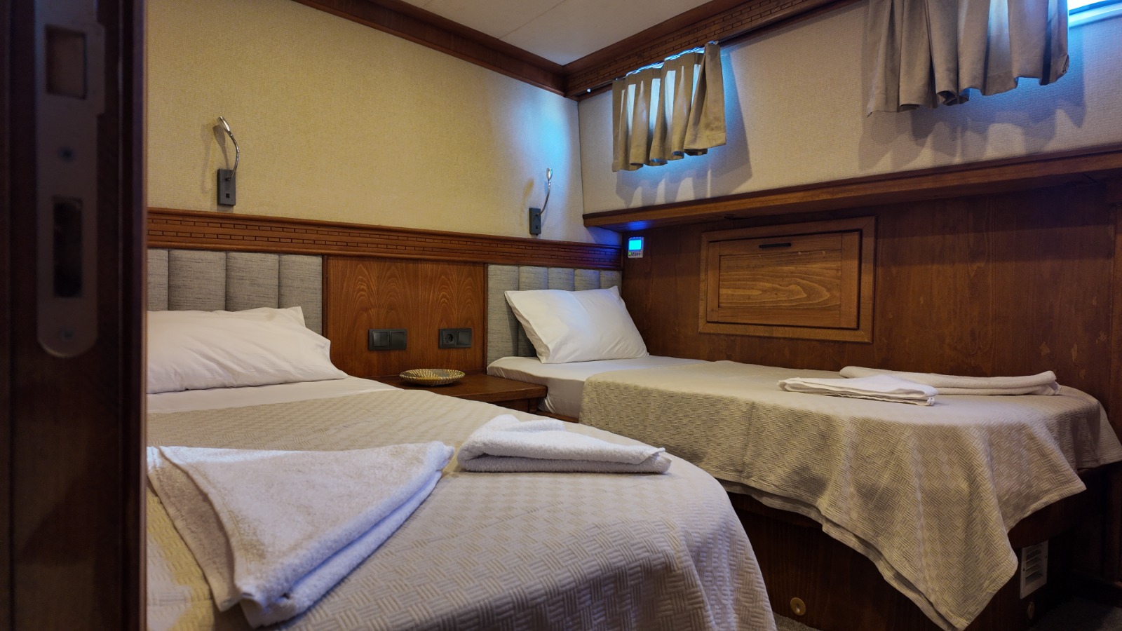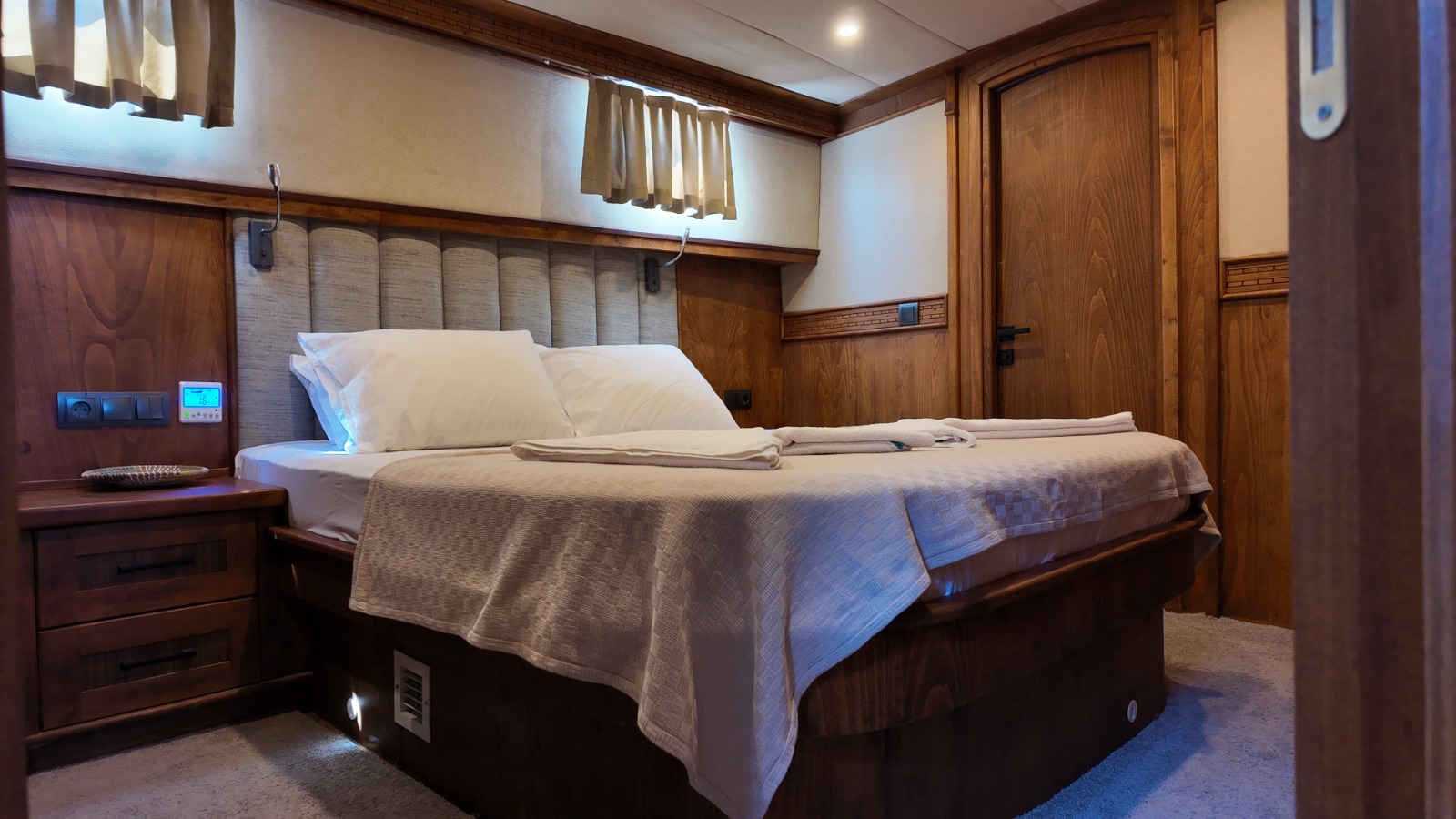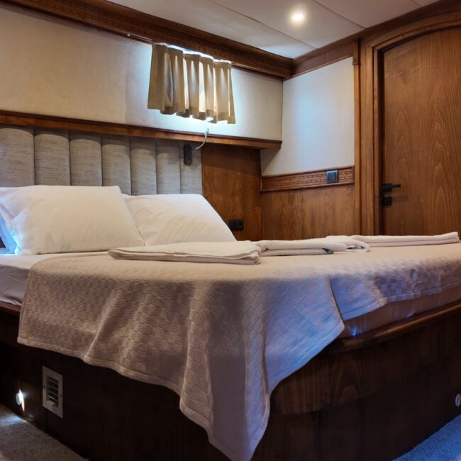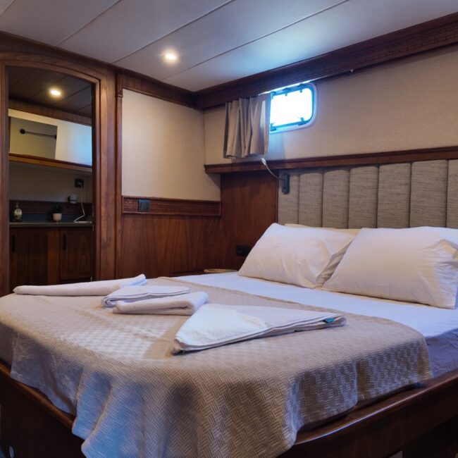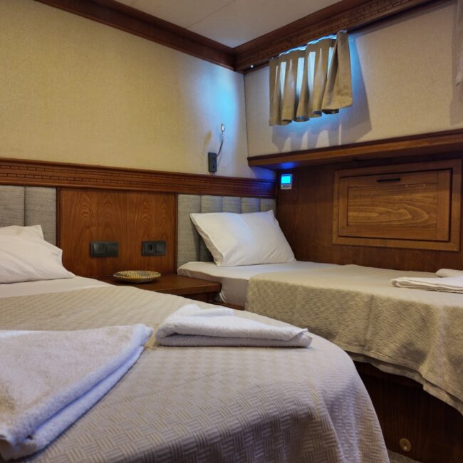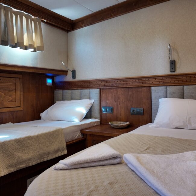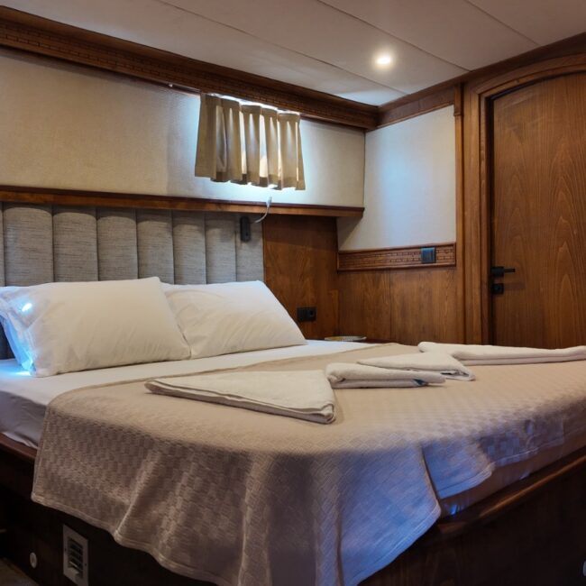 2 double,2 twin ve 1 master kabini bulunmaktadır. 27 metre uzunluğunda 7.5 metre genişliğindedir. Güvertenin kıç bölümünde projeksiyon aleti bulunmaktadır.