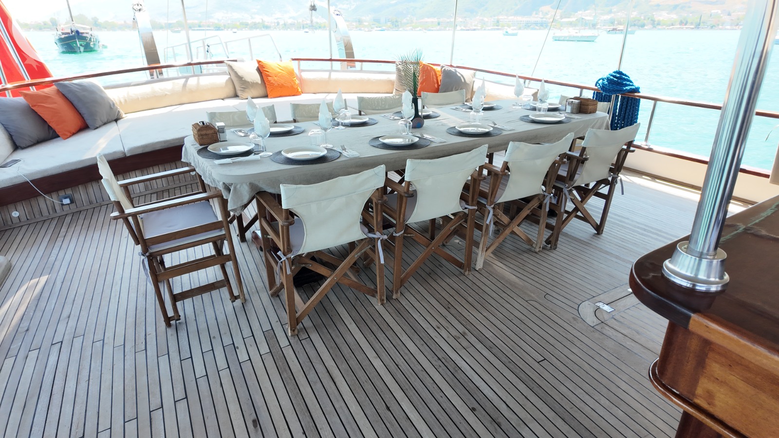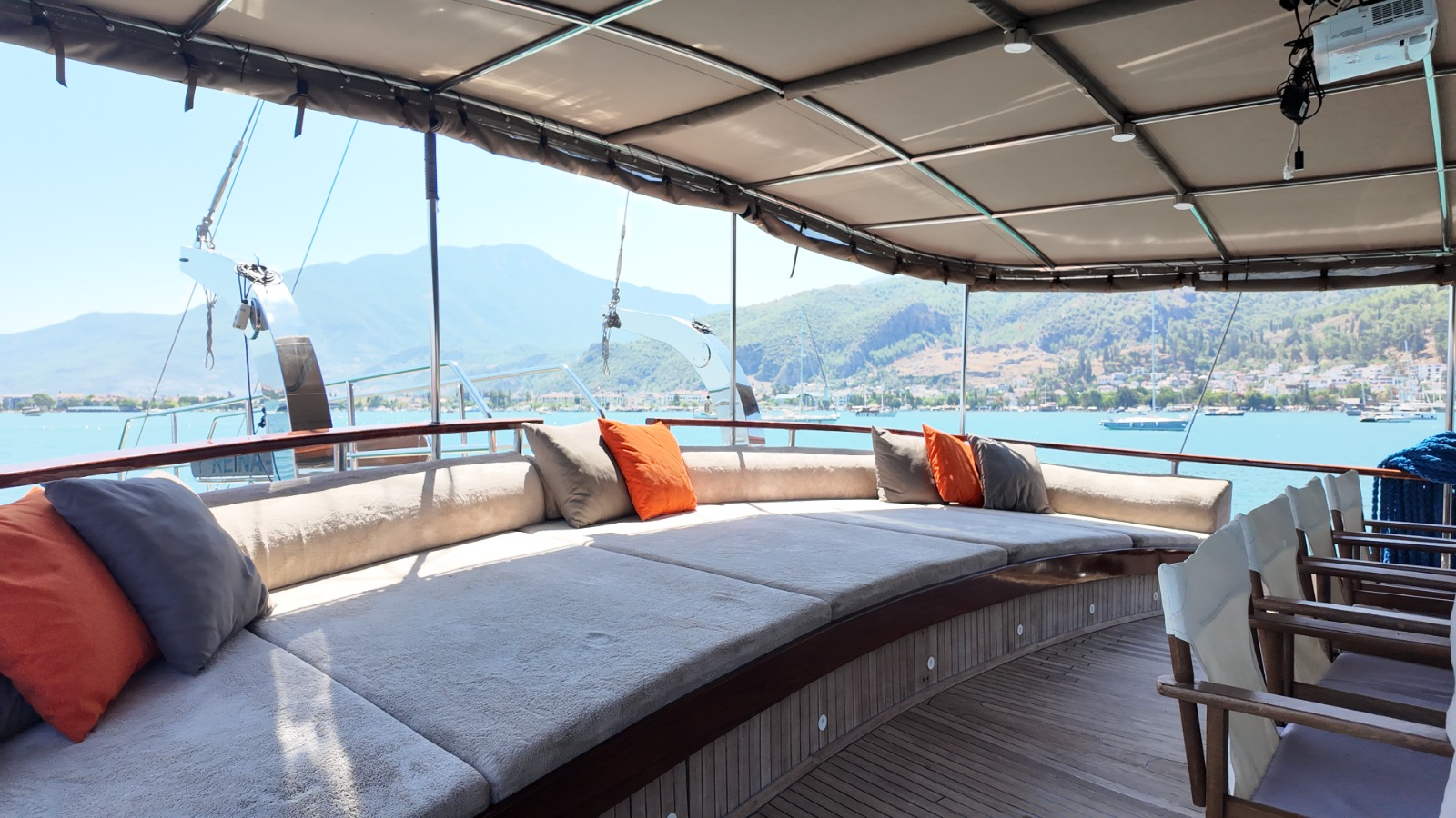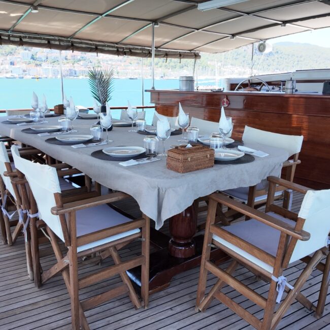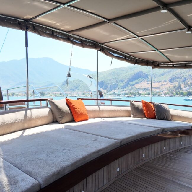 Ön güvertede geniş güneşlenme alanları, 2 adet salıncak ve oturma alanları ile misafirlerimize konforlu dinlenme alanları sunmaktadır.