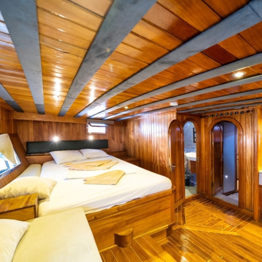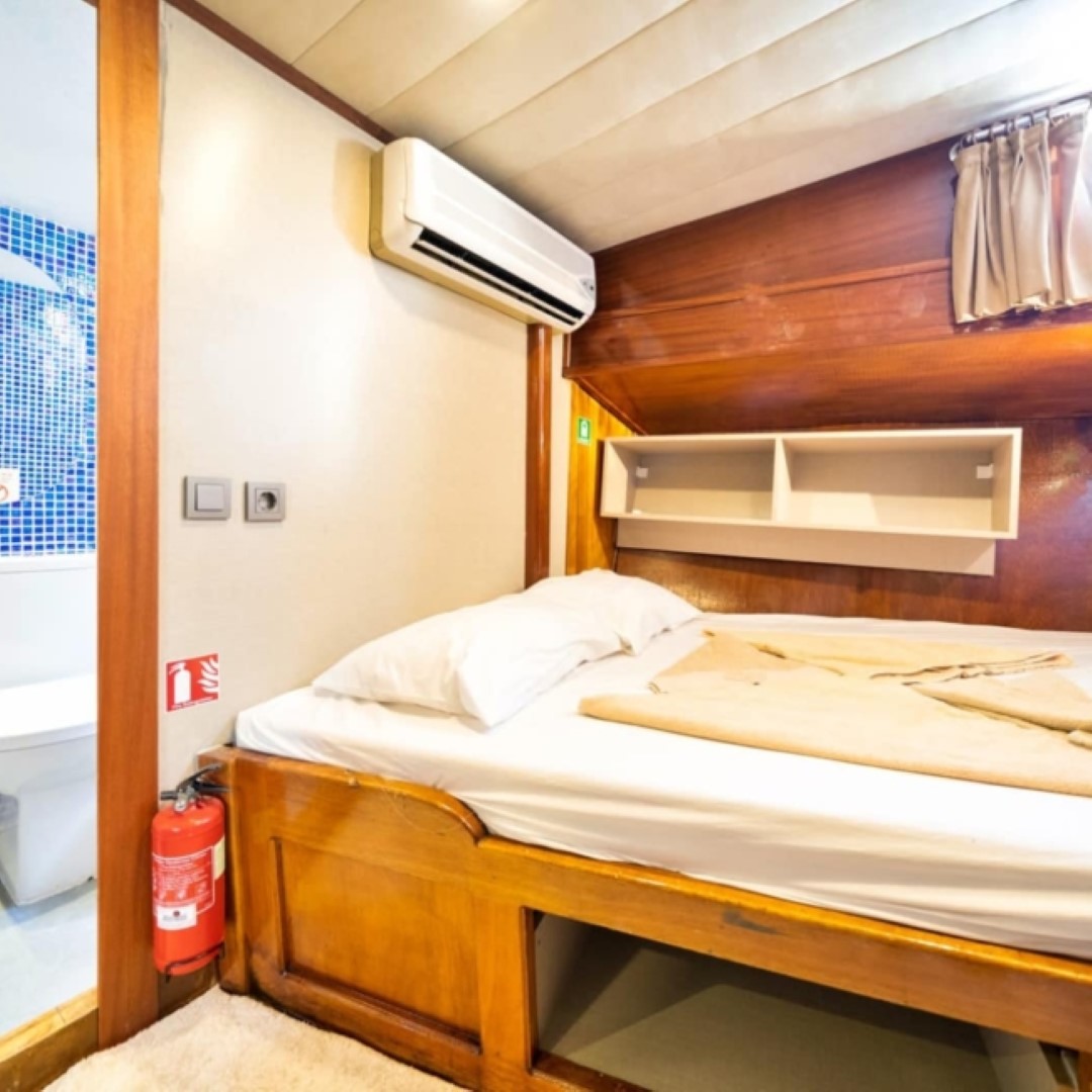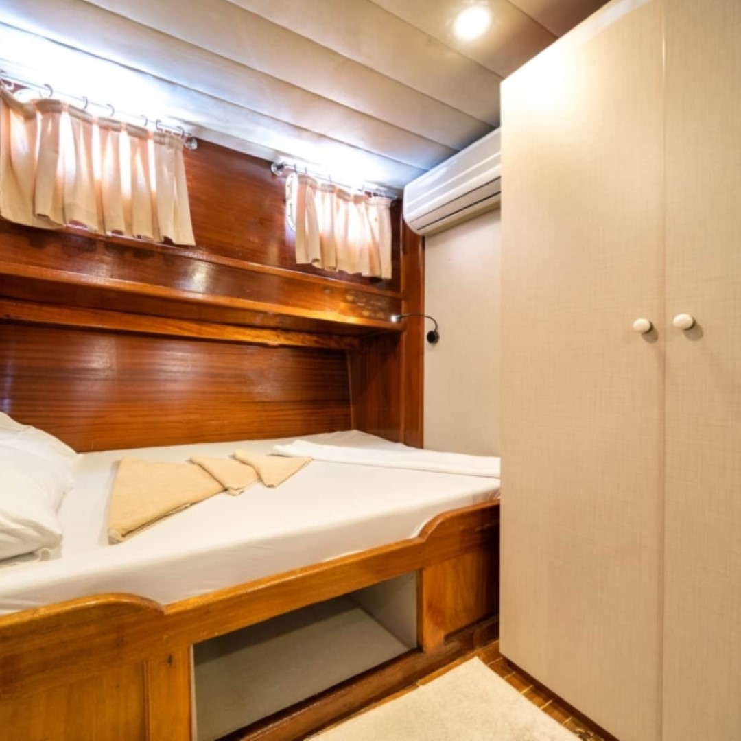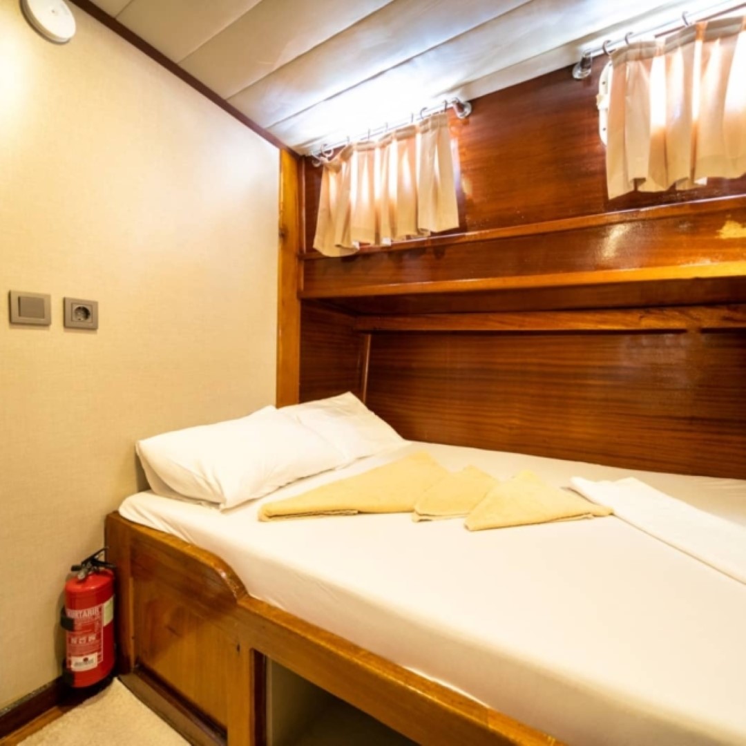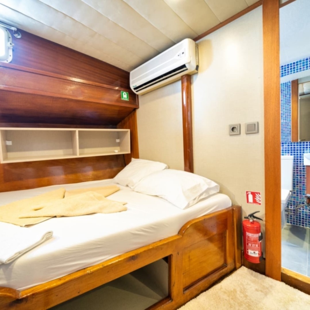 Gulet Serenidad; 1 Master Kabin, 5 Double Kabin olmak üzere toplam 6 kabini mevcuttur. Kabinlerin her birinde kendine ait duş, WC ve