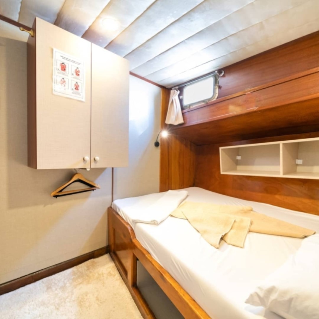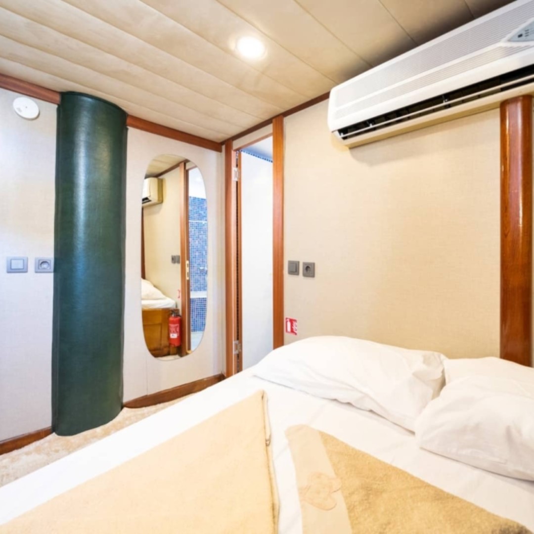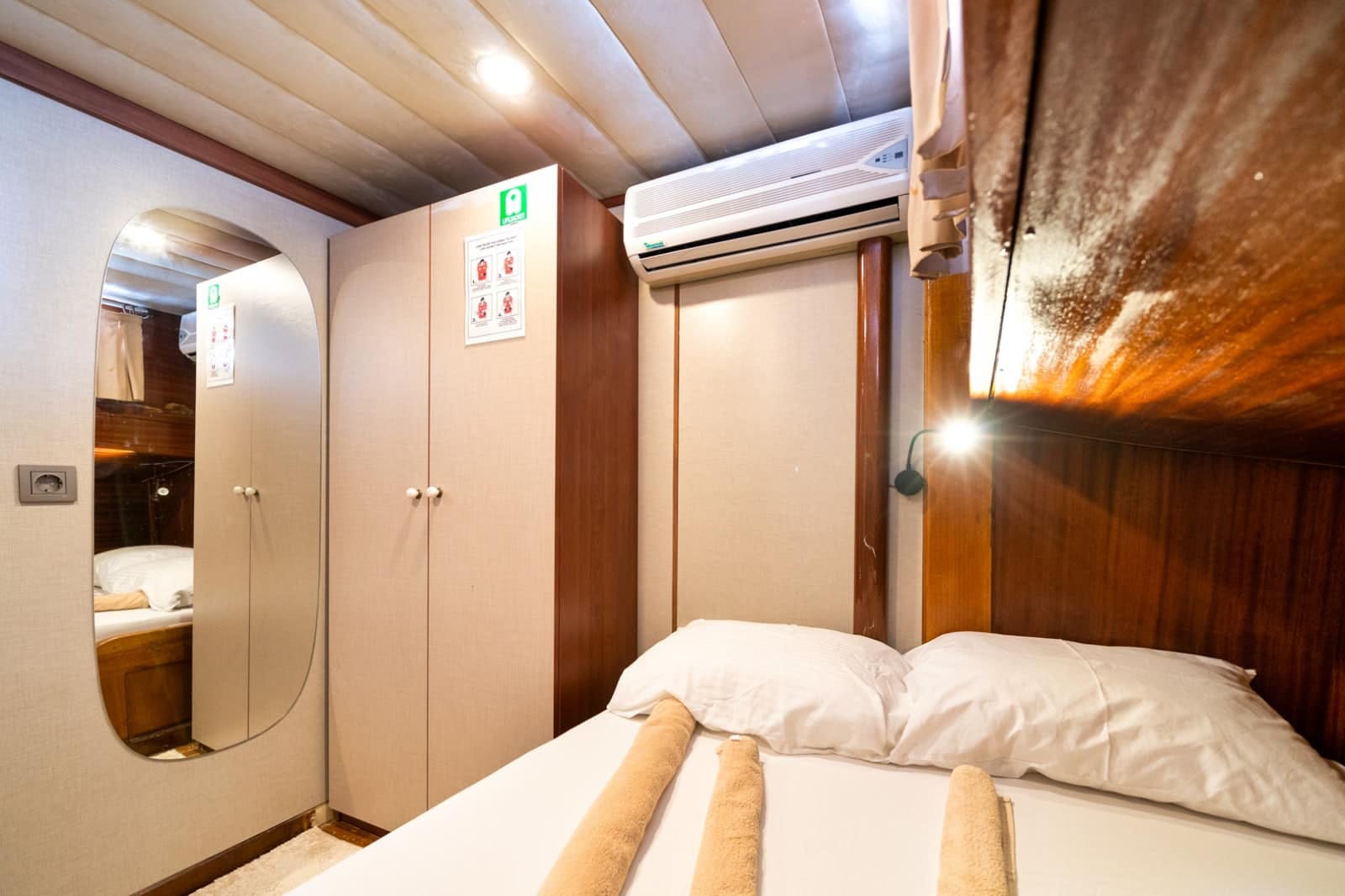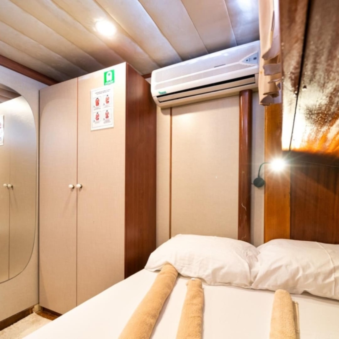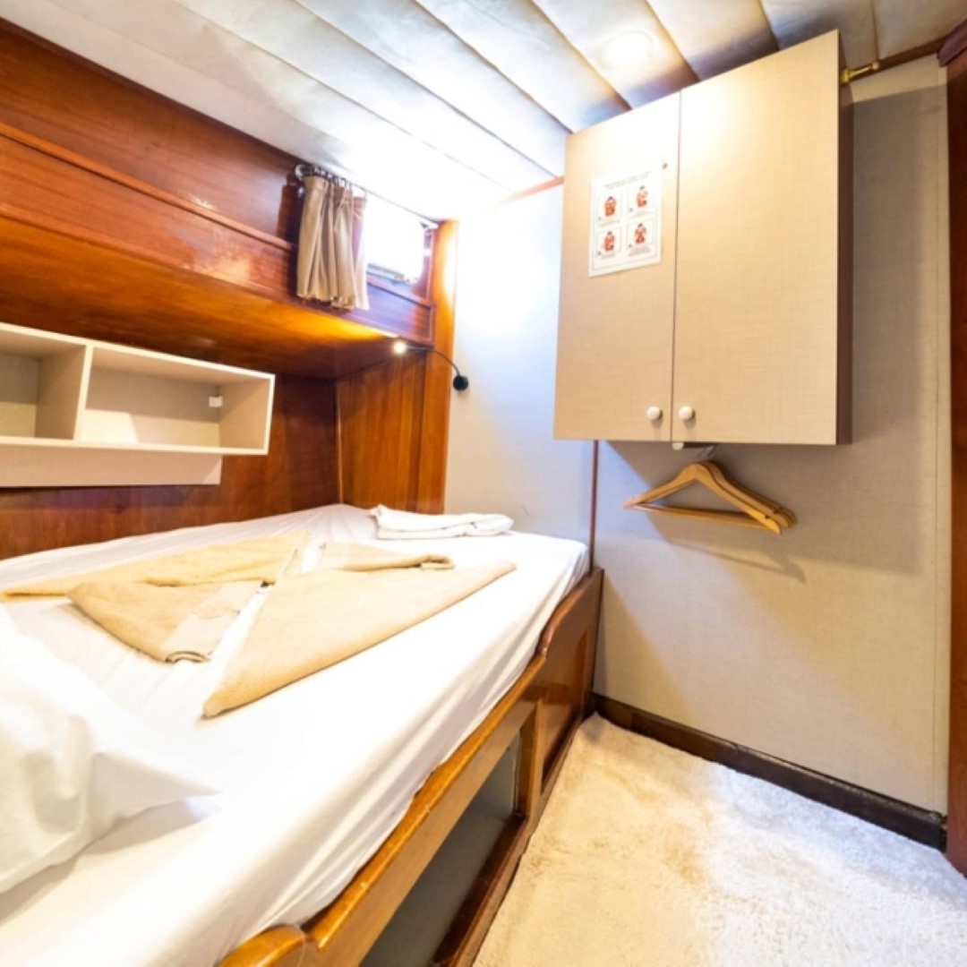 Gulet Serenidad; 1 Master Kabin, 5 Double Kabin olmak üzere toplam 6 kabini mevcuttur. Kabinlerin her birinde kendine ait duş, WC ve