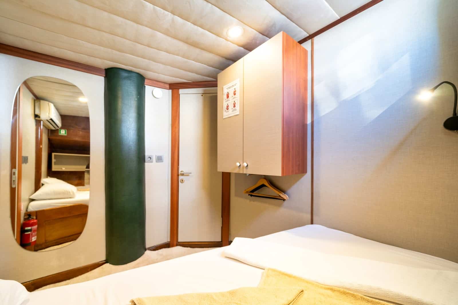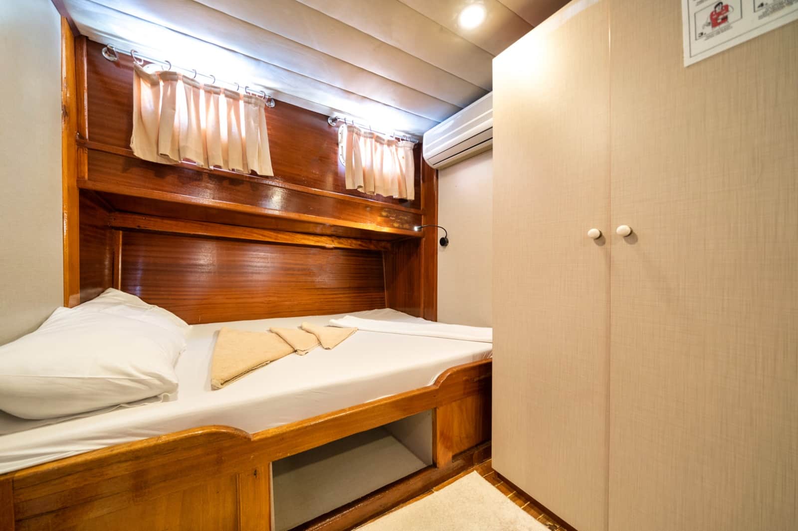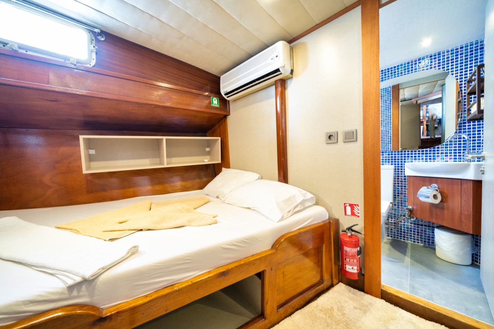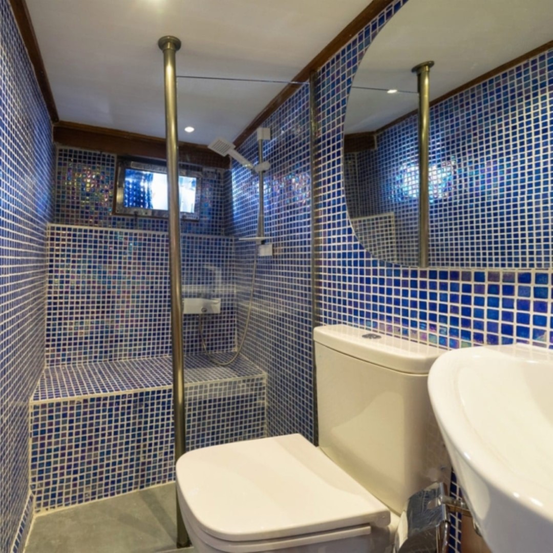 Gulet Serenidad; 1 Master Kabin, 5 Double Kabin olmak üzere toplam 6 kabini mevcuttur. Kabinlerin her birinde kendine ait duş, WC ve