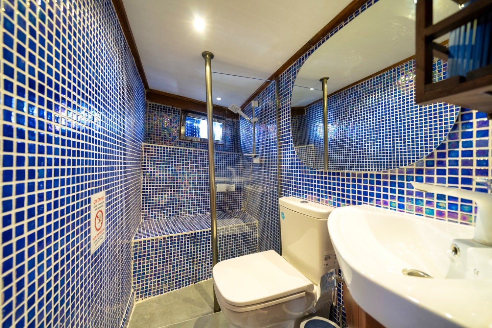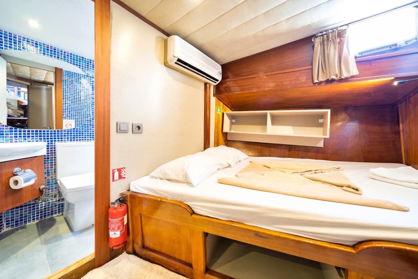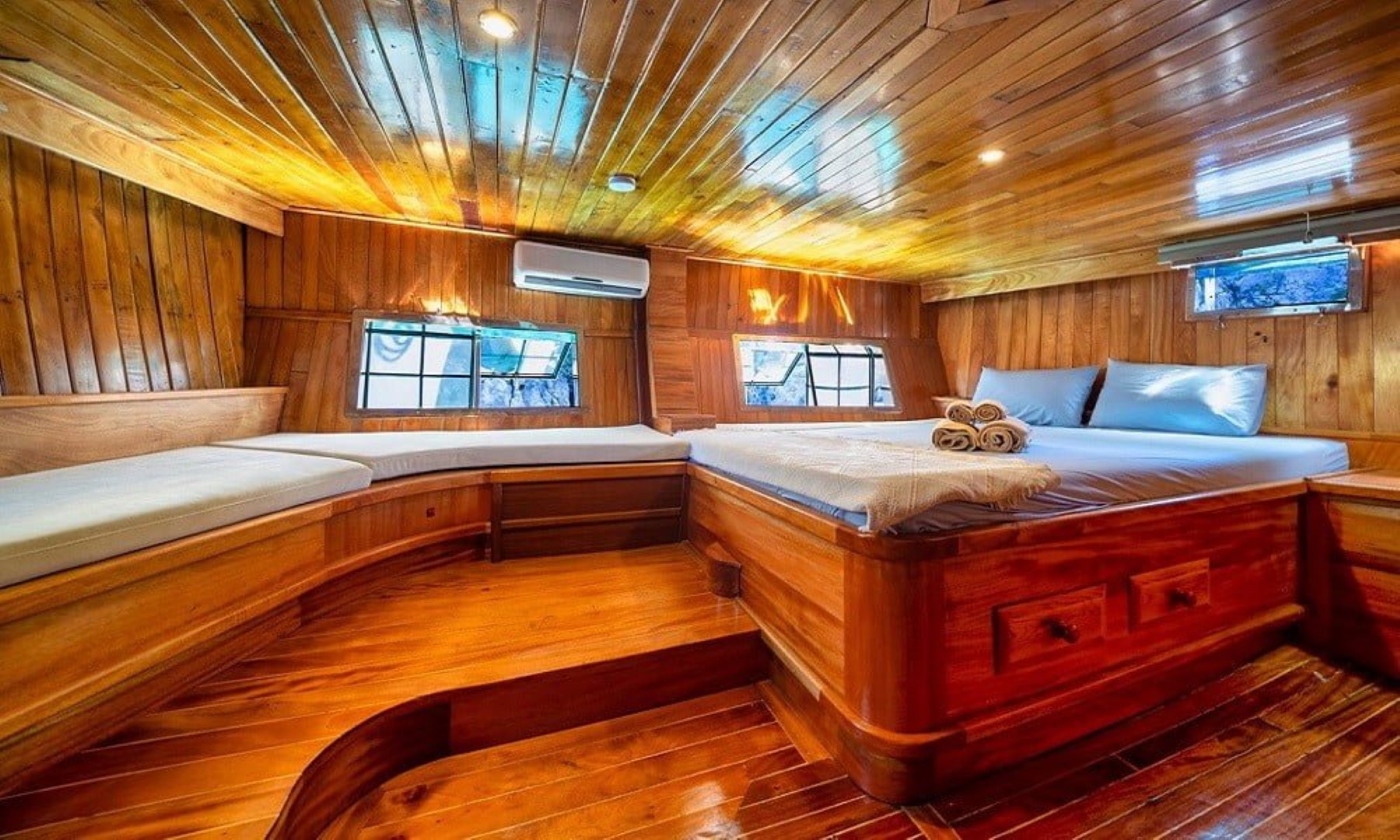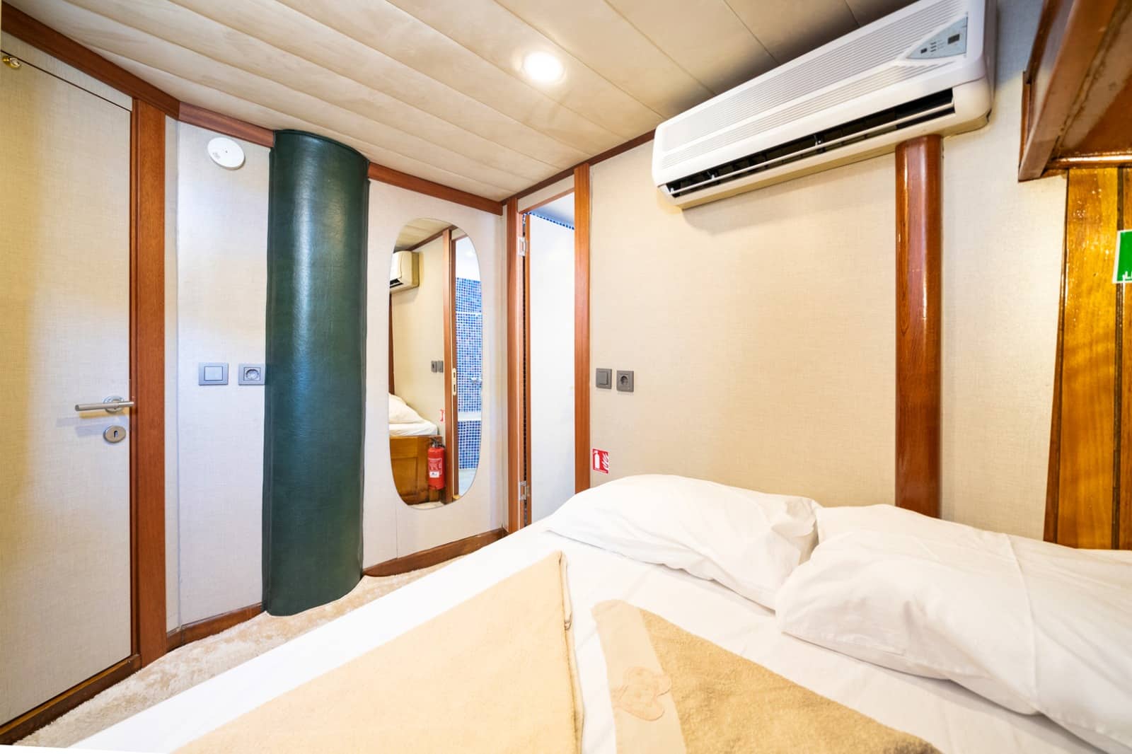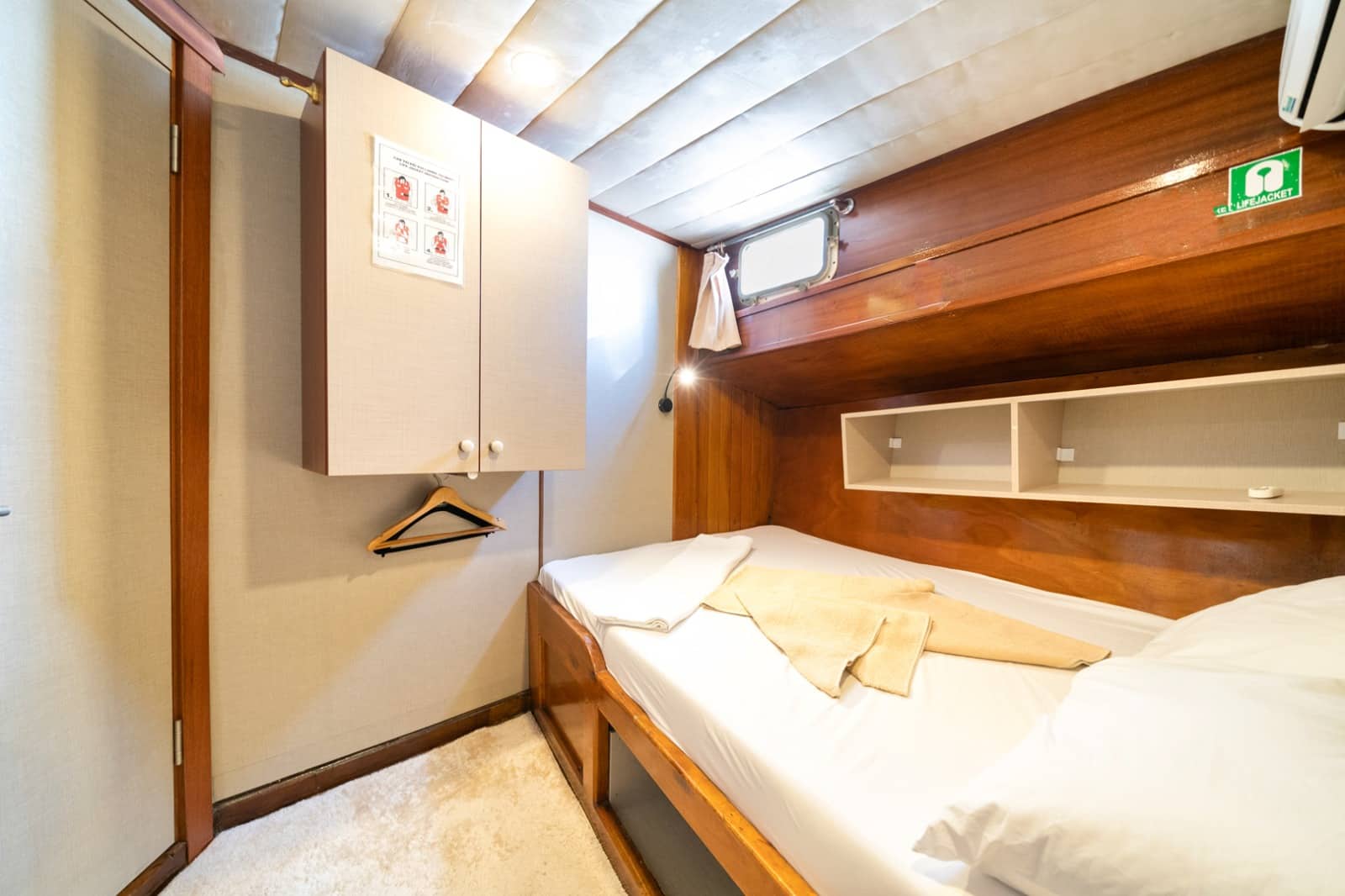 Gulet Serenidad; 1 Master Kabin, 5 Double Kabin olmak üzere toplam 6 kabini mevcuttur. Kabinlerin her birinde kendine ait duş, WC ve