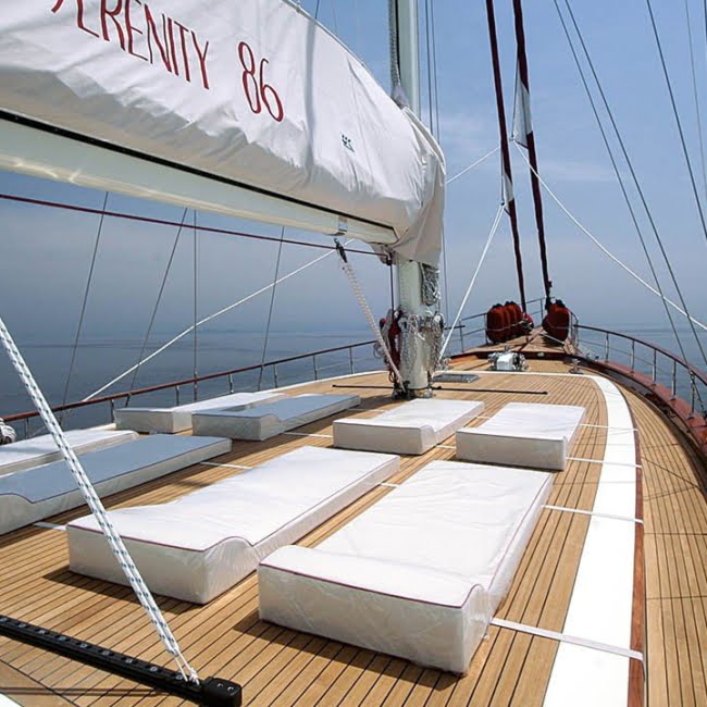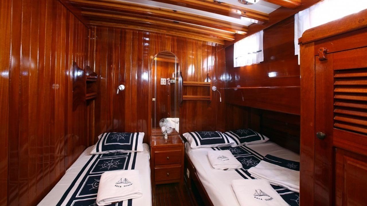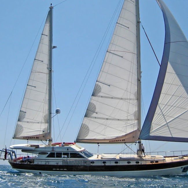 Gulet Serenity 86 2007 yılında 26 m olarak inşa edilip, 2019 yılında modern bir şekilde sizlere daha kaliteli ve iyi bir hizmet sunabilmek için tekrar revize edilmiştir. 1 Master Kabin, 1 Double Kabin ve 2 Twin Kabin olmak üzere toplamda 8 misafir ağırlayabilme kapasitesine sahip geniş, konforlu gulettir. Tüm kabinlerimizde Duş ünitesi, Wc, Klima, Tv, DVD ve Müzik Sistemi mevcuttur. Mürettebatın kendine ait yaşam alanı bulunmaktadır. Profesyonel ekibimiz tur boyunca günlük faaliyetleri organize edip, özenle hazırlanan yeme-içme, temizlik ve günlük bakım hizmetlerini tamamlayıp sizlerin daha rahat vakit geçirmesi için kamaralarına çekilmektedir. Ön güvertede bulunan geniş güneşlenme alanı ve minderleri yeterli miktarda mevcuttur.
