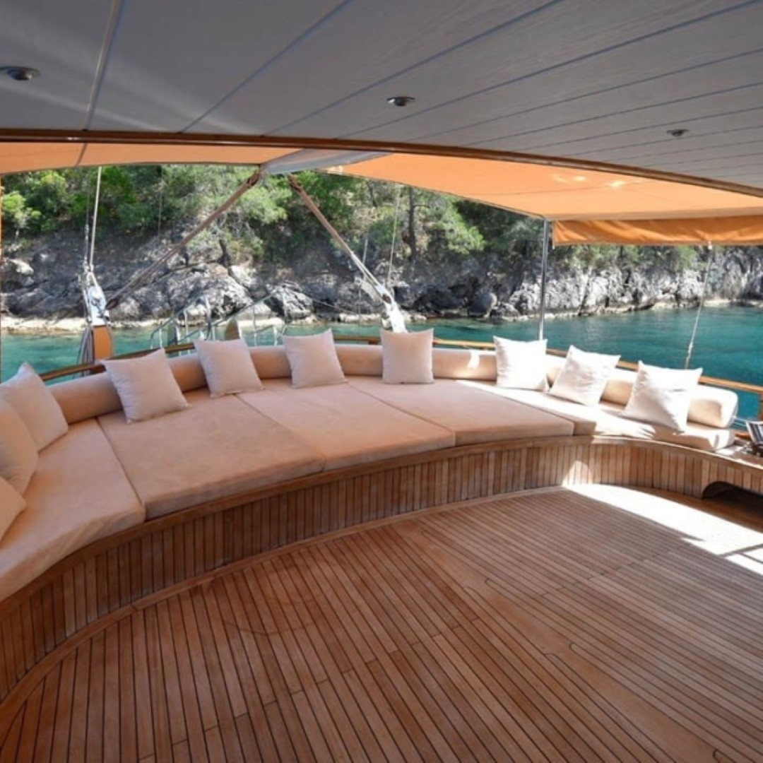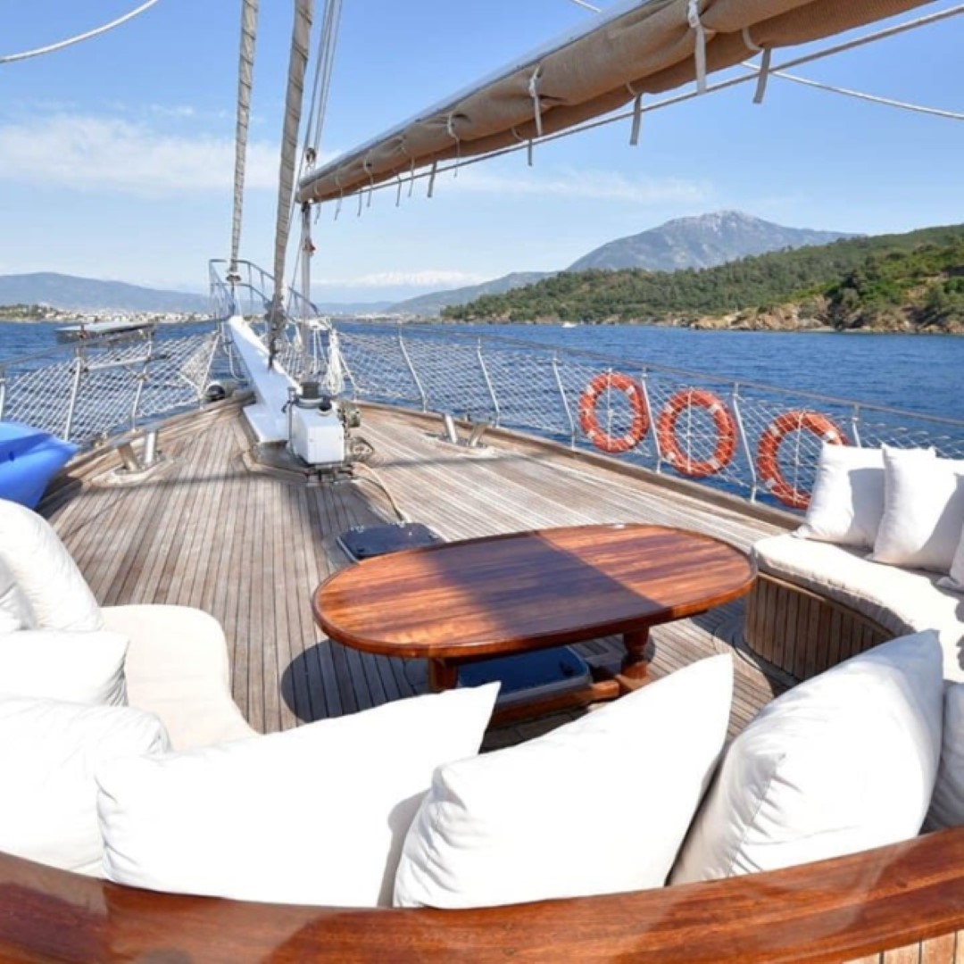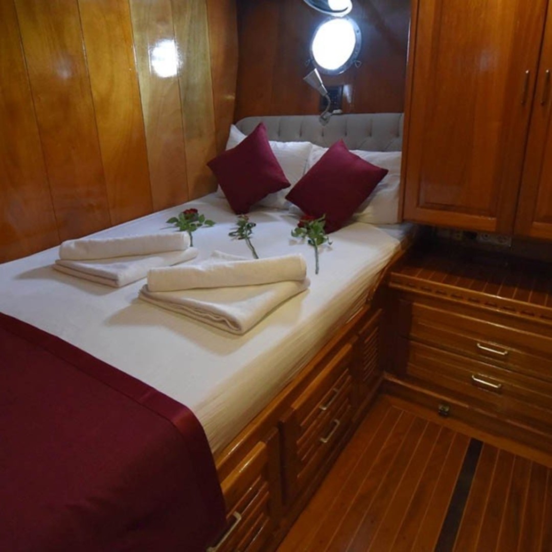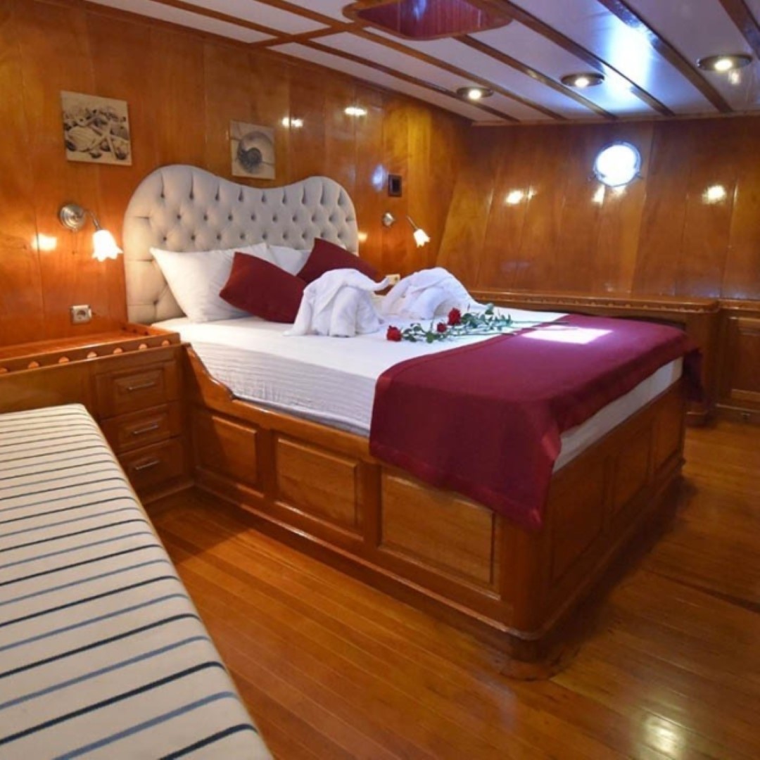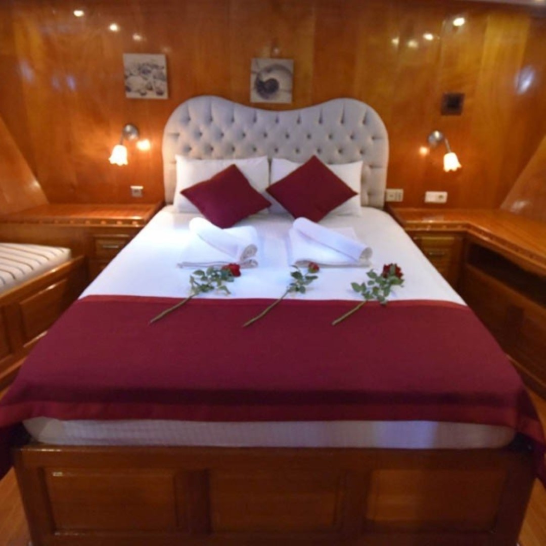 Gulet Su Sesi teknemiz 2009 yılında inşa edilmiş olup, 2019 yılında baştan sona renovasyona uğramıştır. 2 Master Kabin ve 4 Double Kabin ile 12 misafir ağırlayabilmekteyiz. Tüm kabinlerde Klima, Ev Tipi Tuvalet ve Duş bulunan teknemizde Klima kullanımımız maksimum 4-6 saattir. Salonda LCD TV ve Müzik sistemi bulunan teknemiz, tam donanımlı bir mutfağa sahiptir. Geniş güneşlenme alanı ve oturma alanlarıyla kulanım açısından son derece konforlu olan teknemizde sizleri ağırlamaktan memnuniyet duyarız.