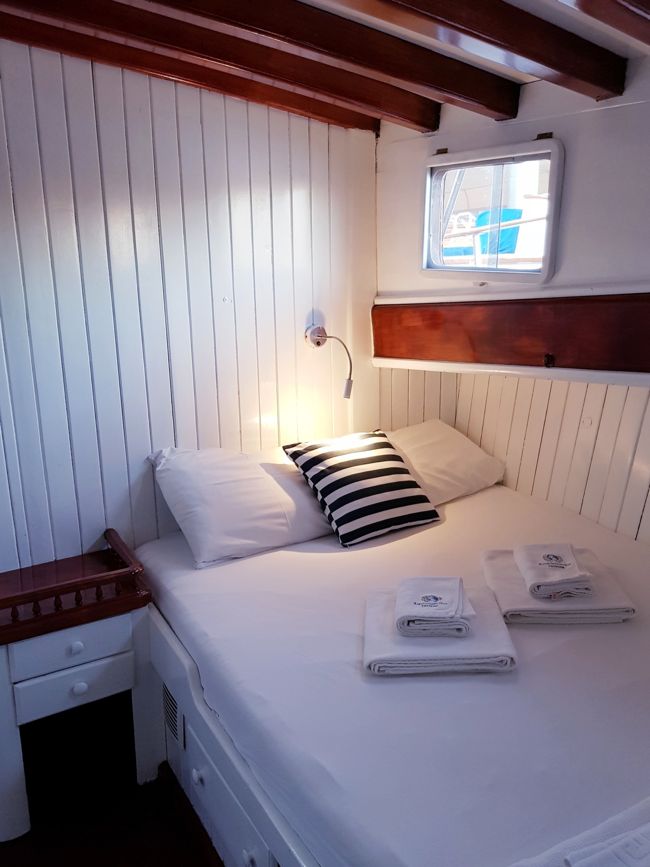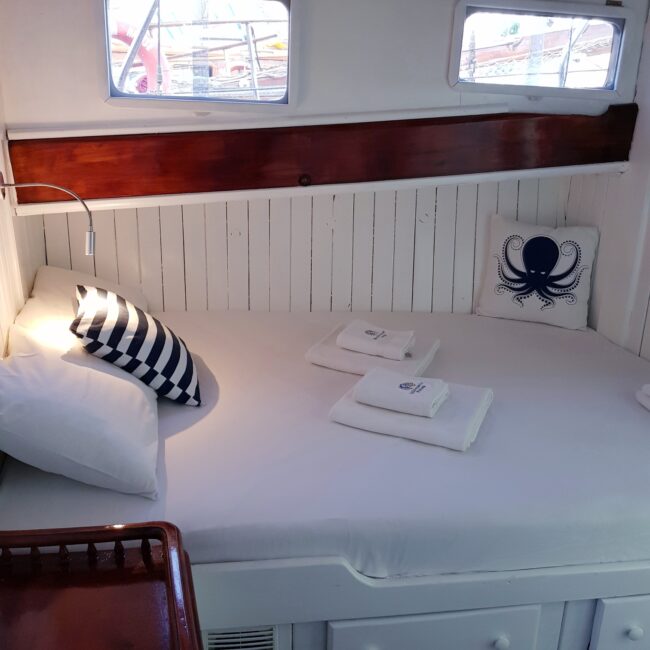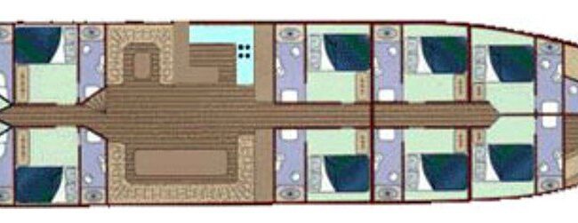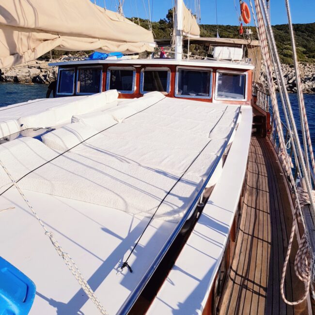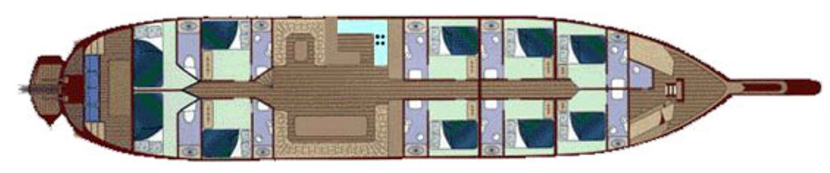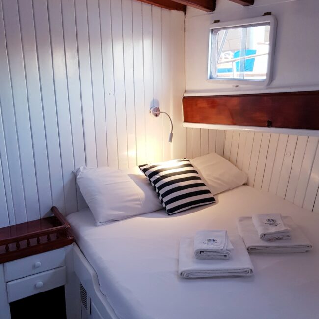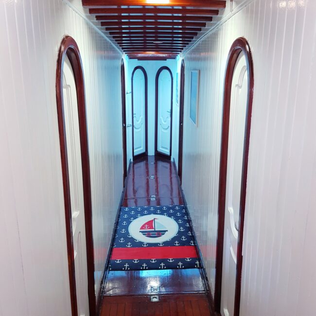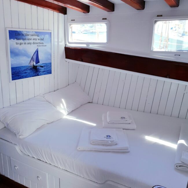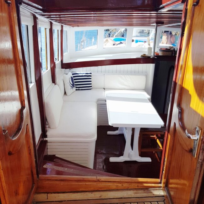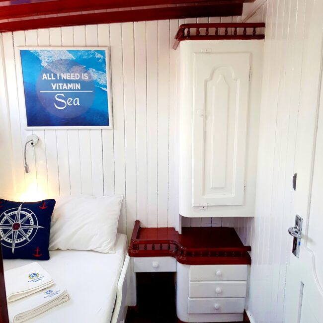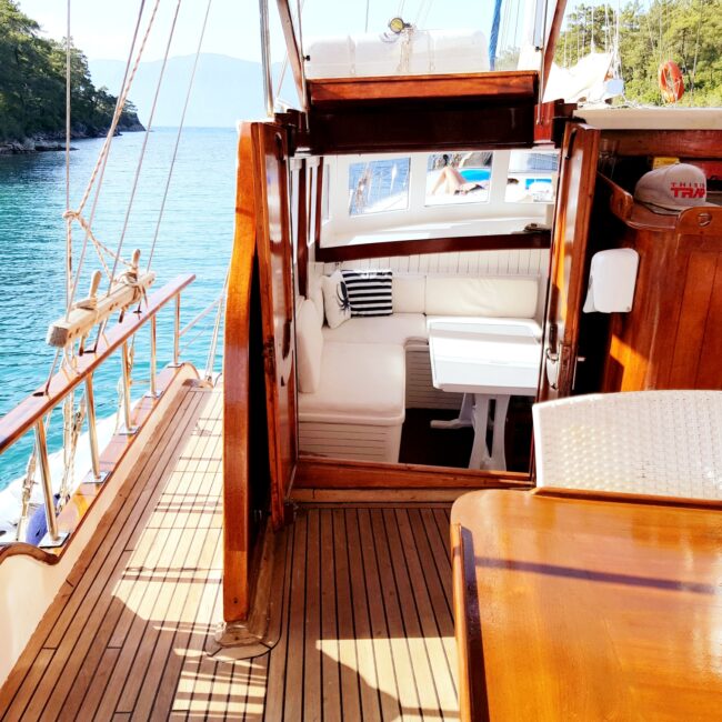 bakımlı, klasik tarzda döşenmiş kabinlerin her birinde klima, duş – WC ve internet hizmeti bulunmaktadır. Yatımızın arka güvertesinde yemek masası ve dinlenme