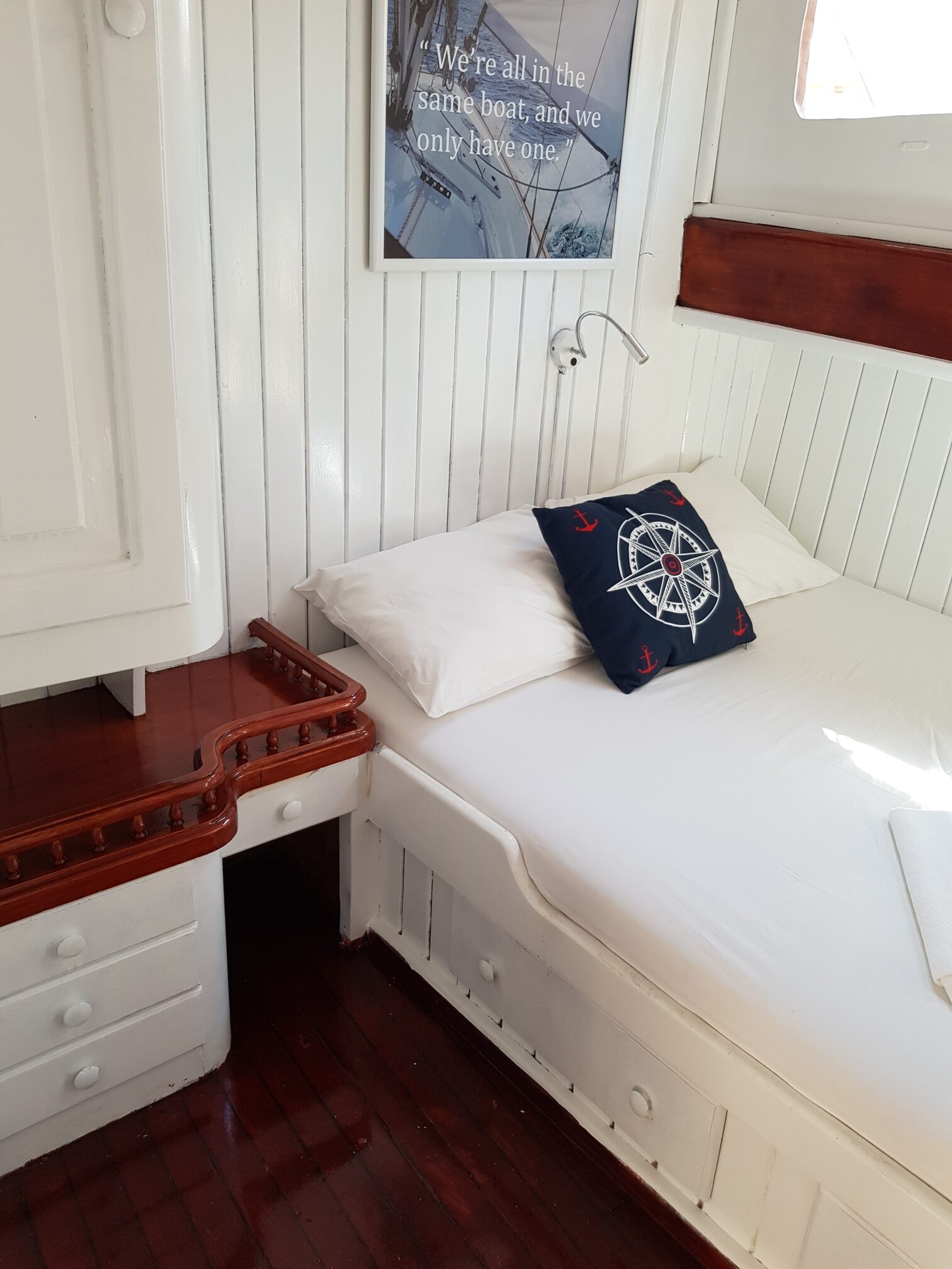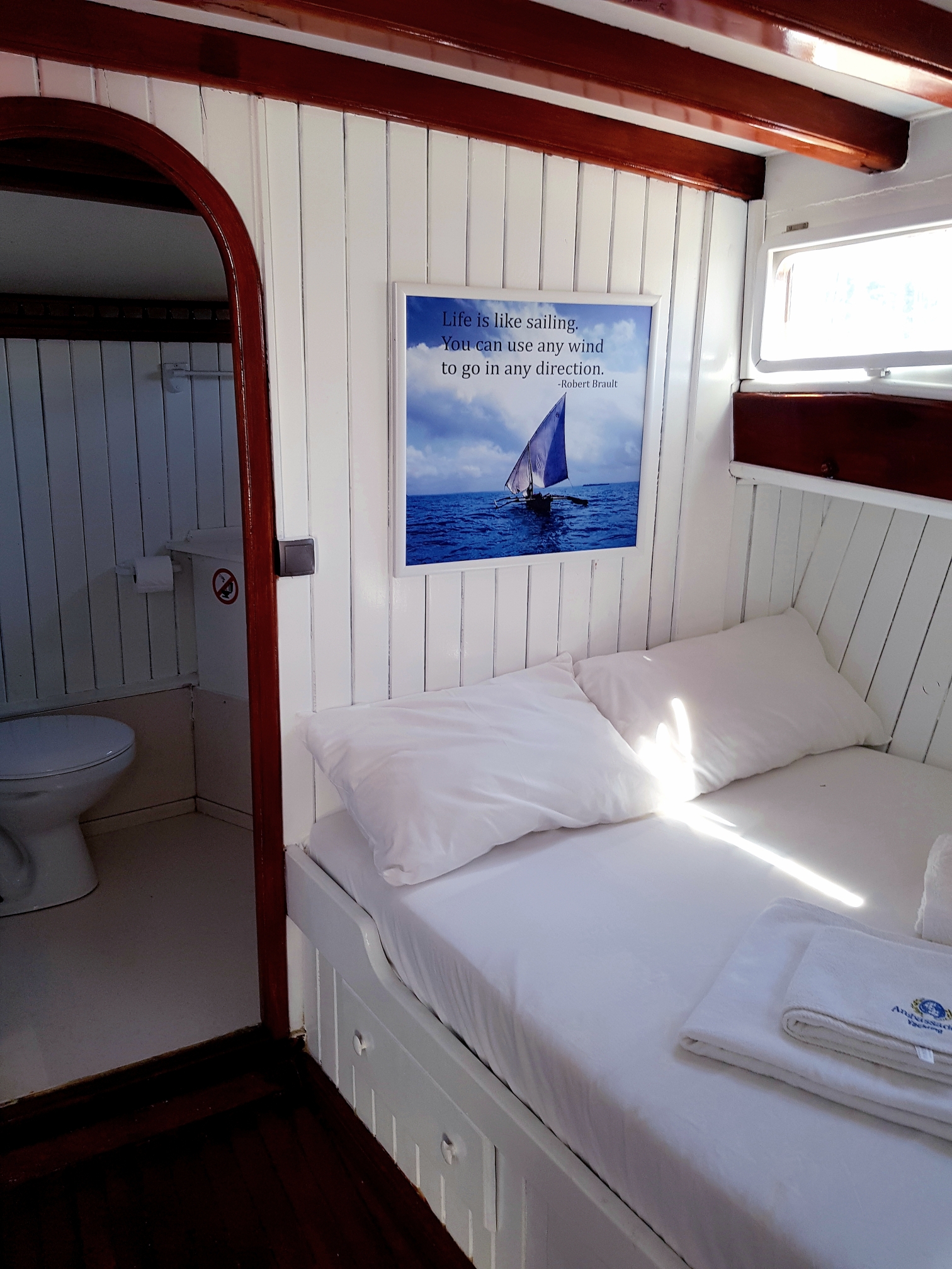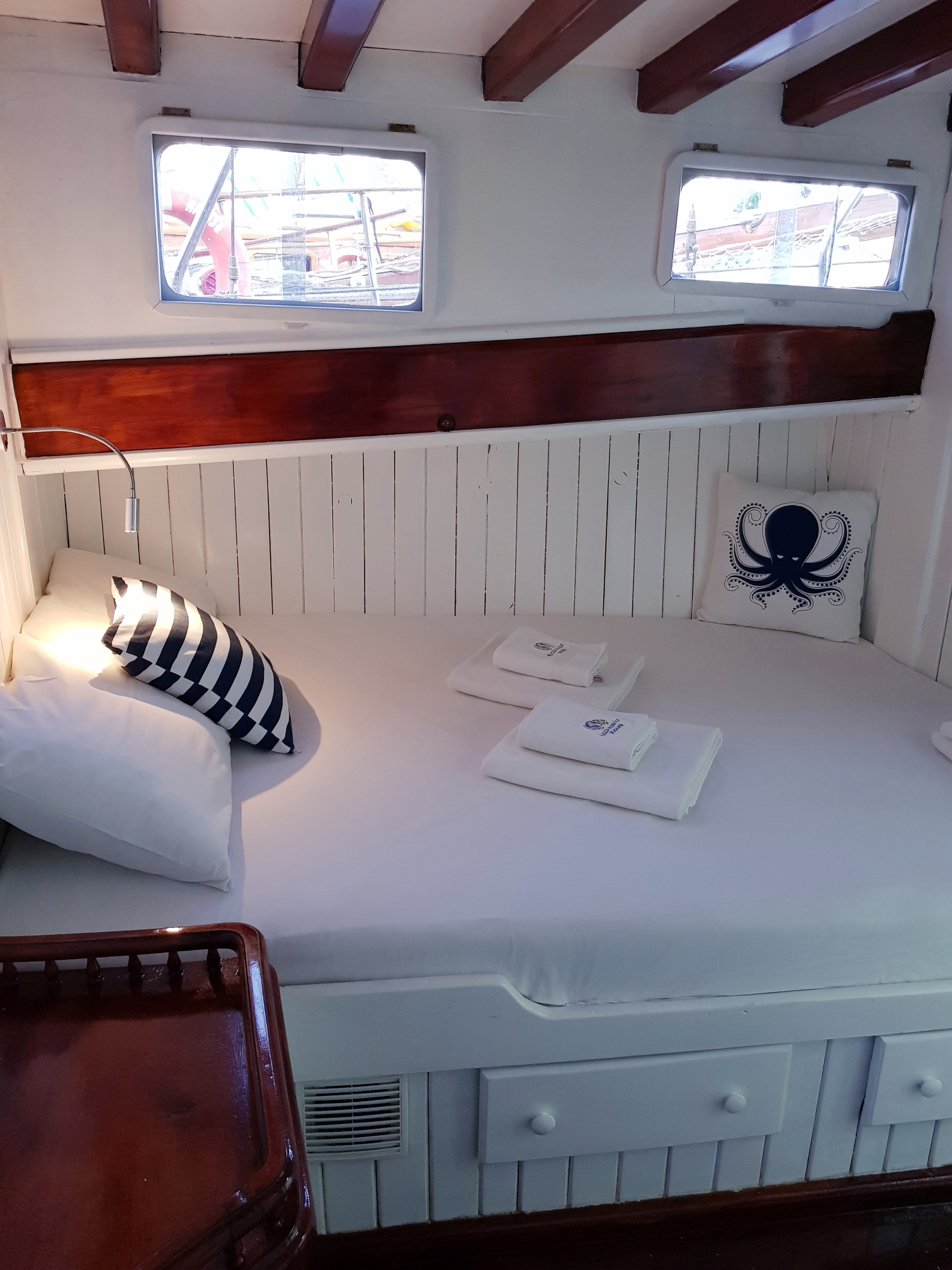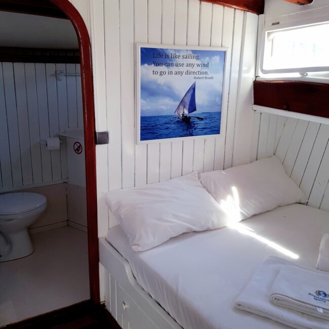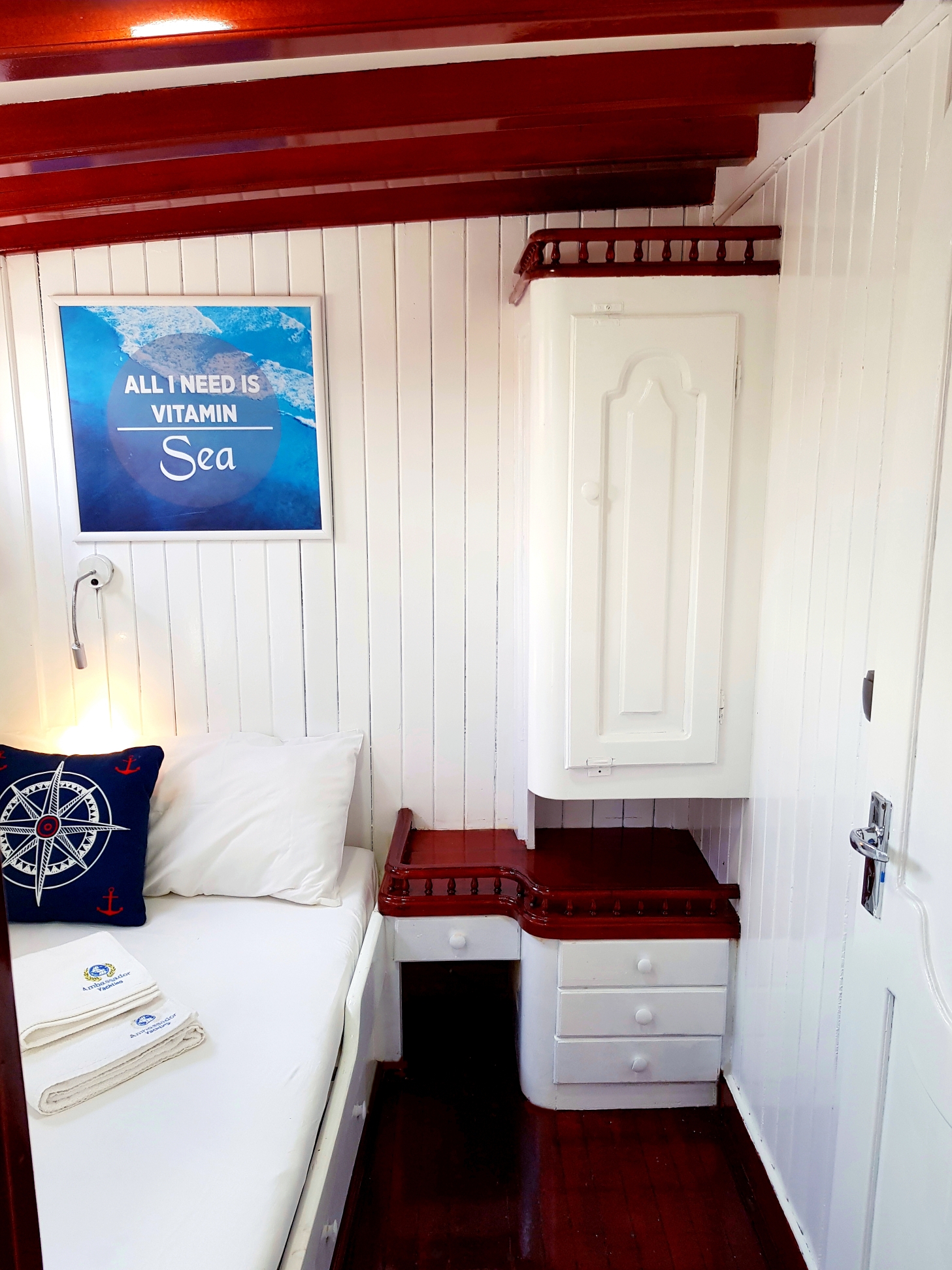 bakımlı, klasik tarzda döşenmiş kabinlerin her birinde klima, duş – WC ve internet hizmeti bulunmaktadır. Yatımızın arka güvertesinde yemek masası ve dinlenme
