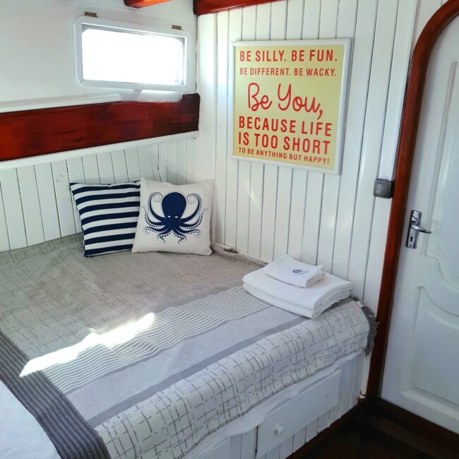2017 yılında tamamen yenilenen yatımız, 6 double ve 2 triple kabiniyle toplamda 16 kişiye kadar konaklama kapasitesine sahiptir. Türk karasuları içerisinde